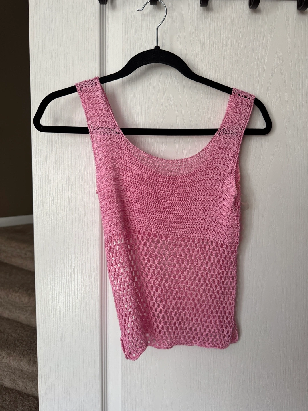 Selling a cute pink crochet tank top! It's in great condition and features a unique crochet design. Perfect for adding a touch of handmade charm to your wardrobe