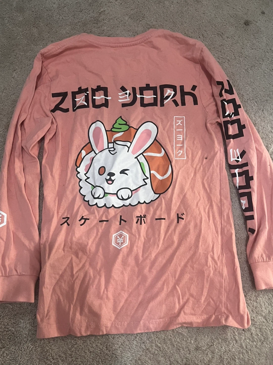 This is a Zoo York long sleeve shirt. It's pink and features a cute bunny design. The brand name is printed on the sleeves.