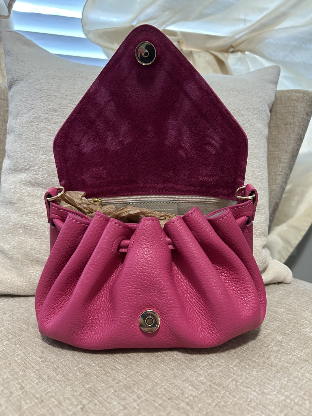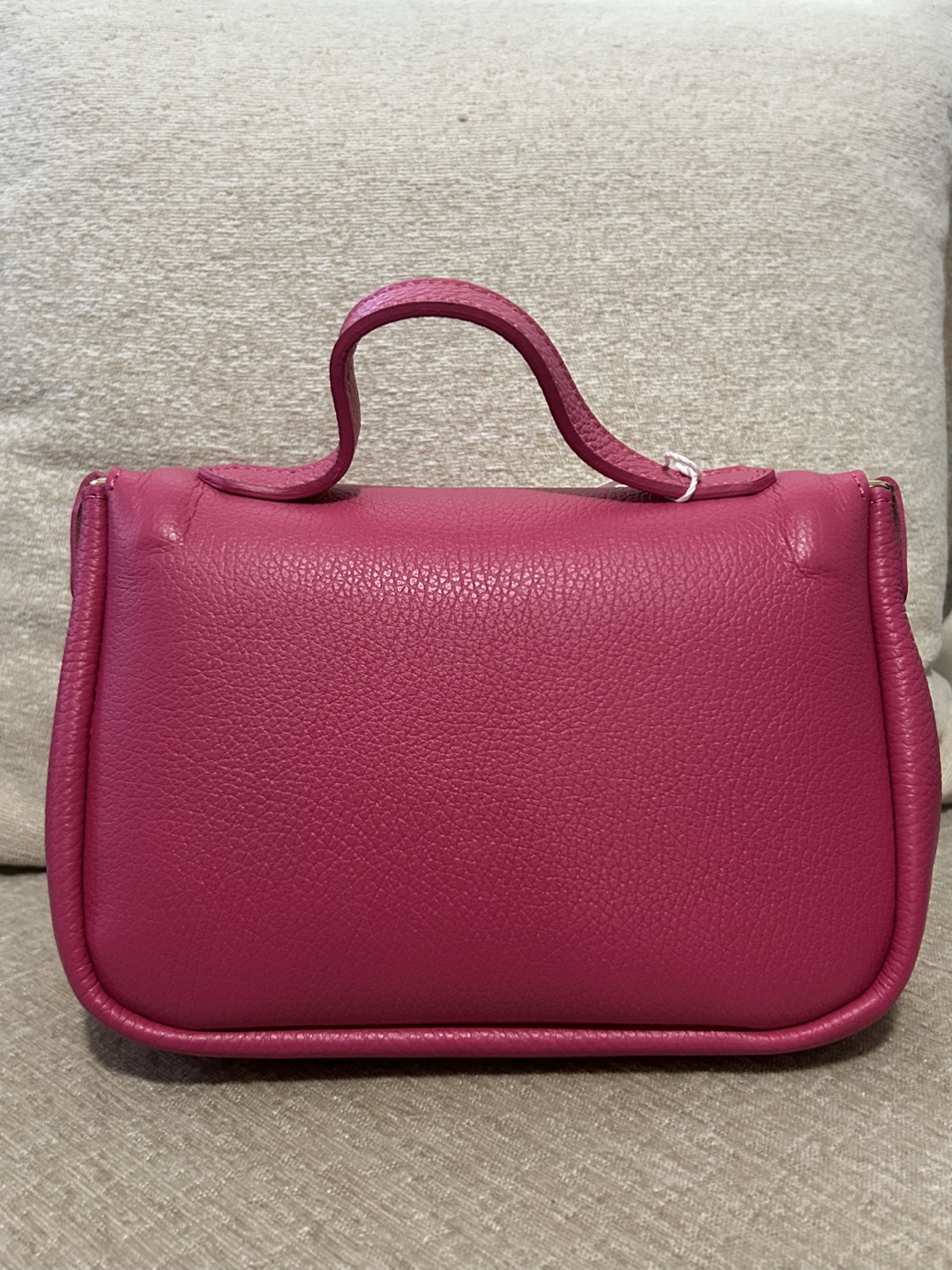 Selling a cute pink leather handbag! It's made in Italy and has a unique design. The bag comes with an additional strap, so you can wear it as a crossbody if you like. The interior is lined with a soft suede-like material. It's in great condition and ready for a new home