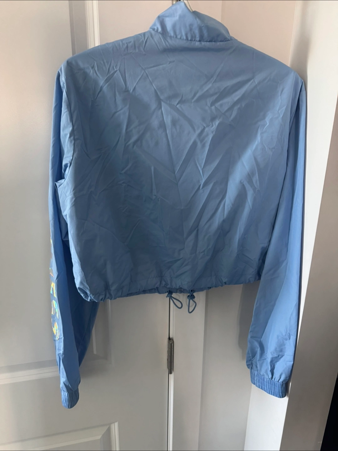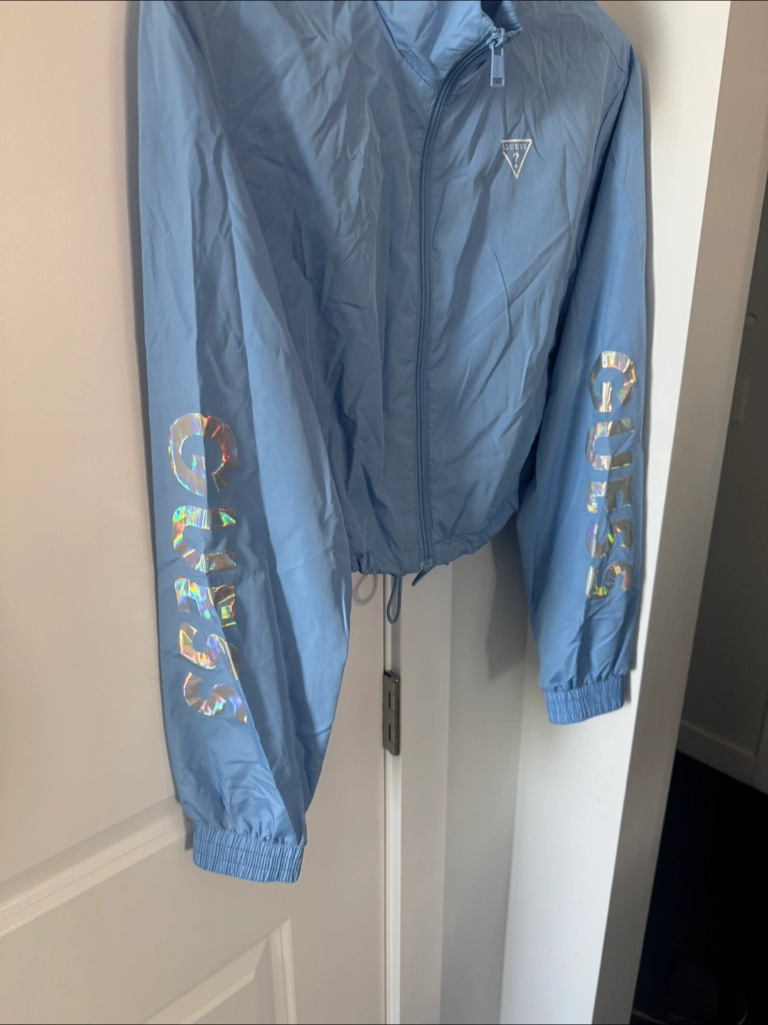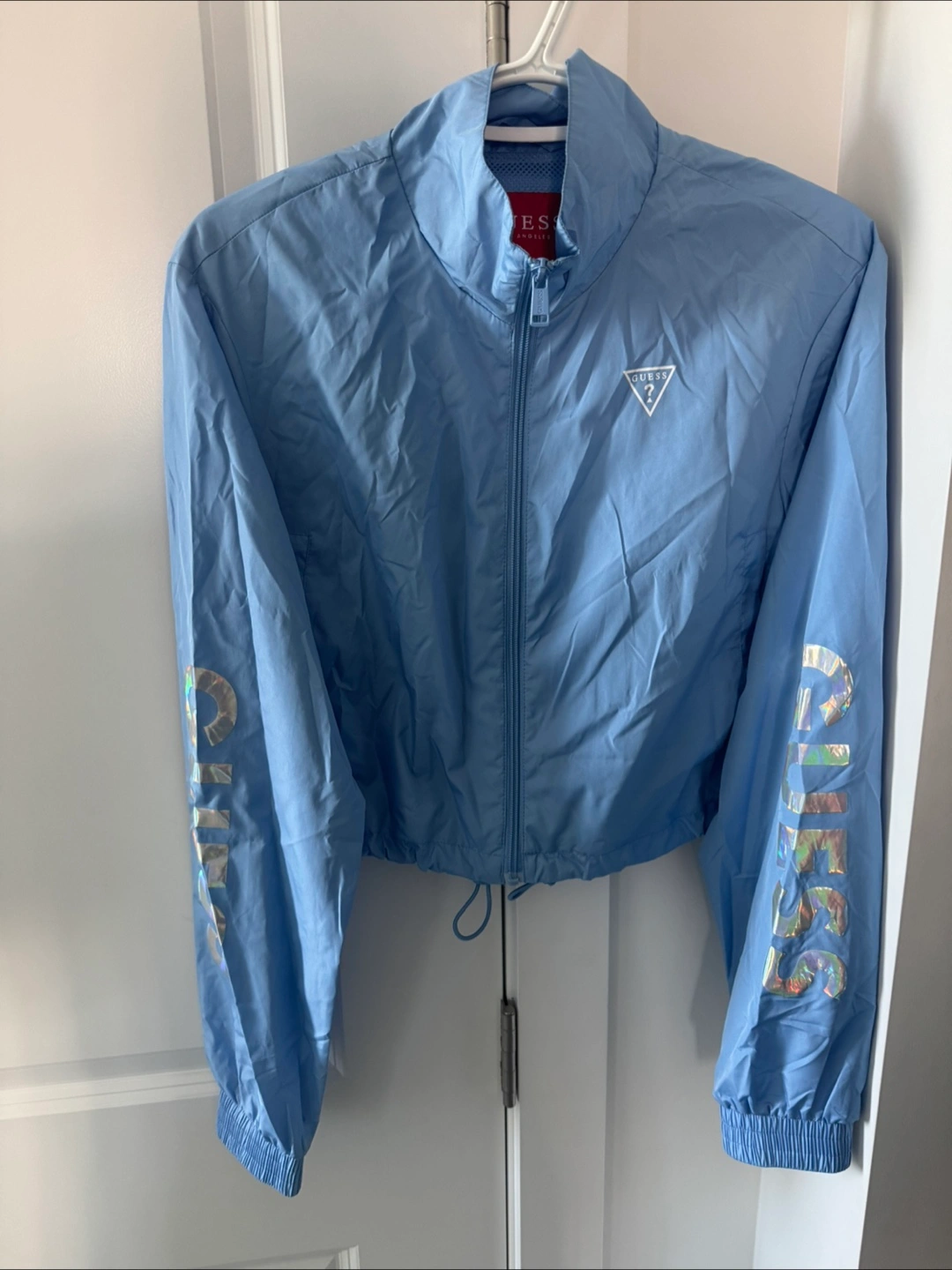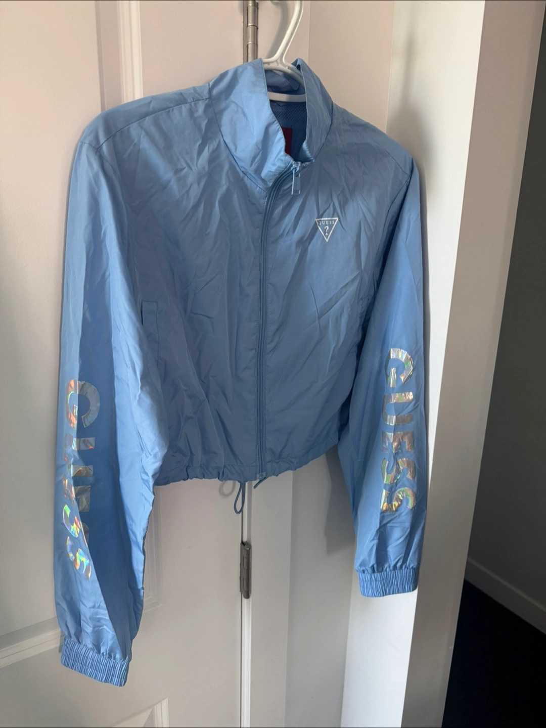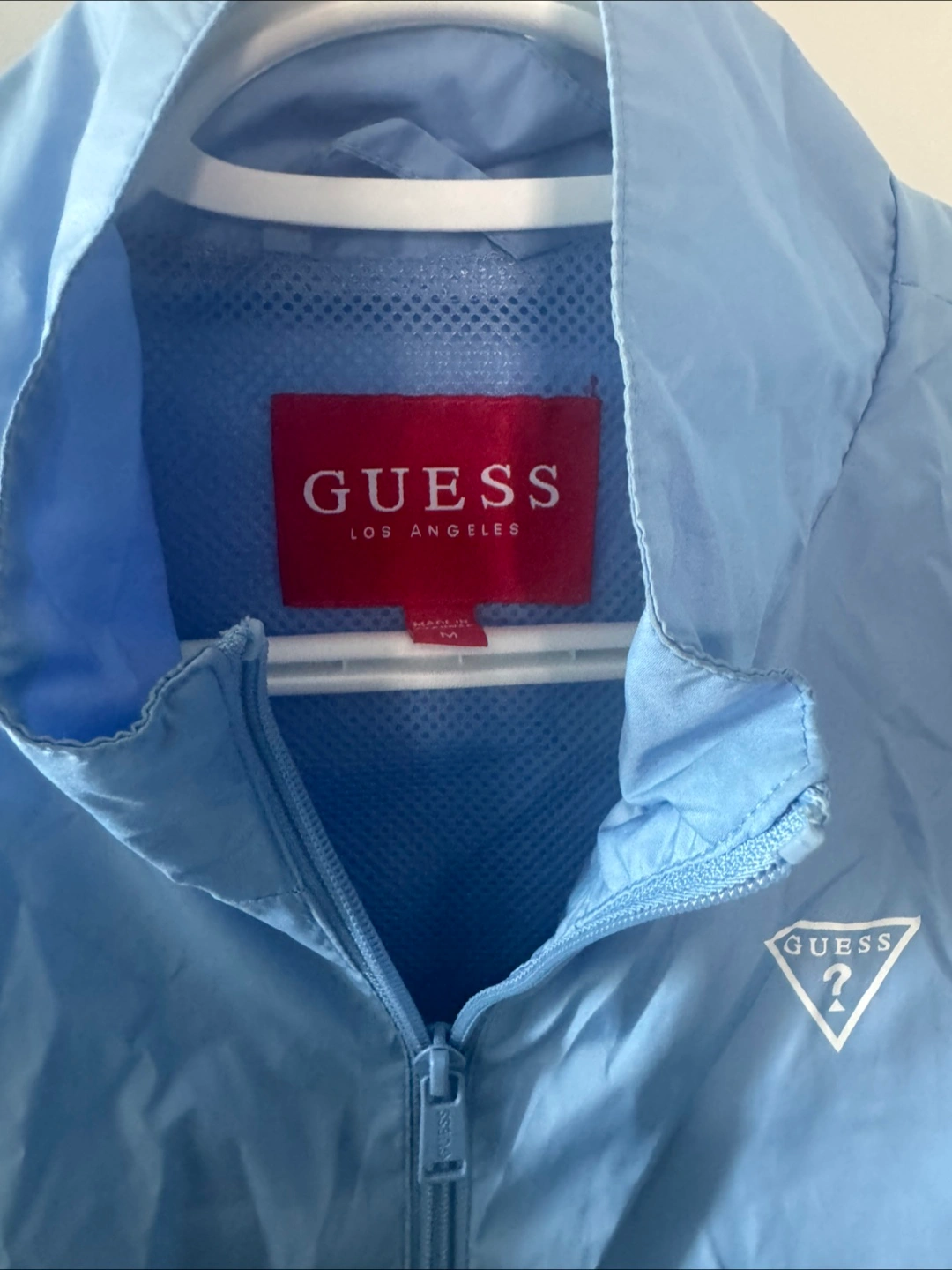 Selling a cute Guess windbreaker jacket in a light blue colour! It's a size medium and has the Guess logo on the front and down the sleeves. Perfect for those breezy days or layering up!