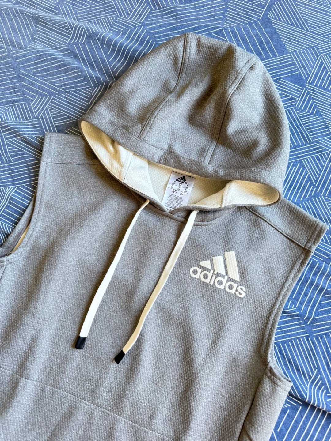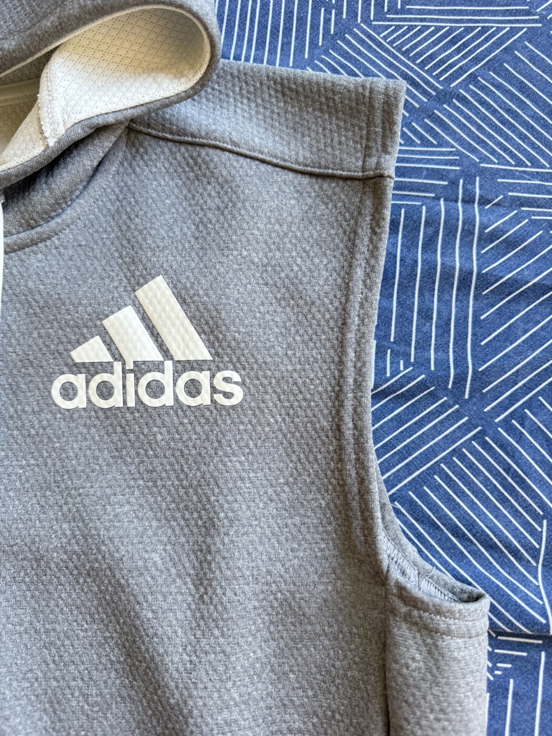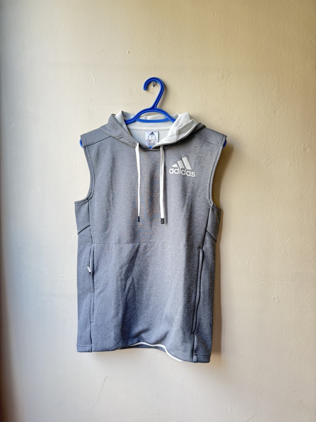 Adidas sleeveless hoodie in size XS - S. It's a great piece for layering or wearing on its own during workouts. The hoodie is in excellent condition and features the classic Adidas logo. Perfect for anyone looking for a sporty and comfortable addition to their wardrobe