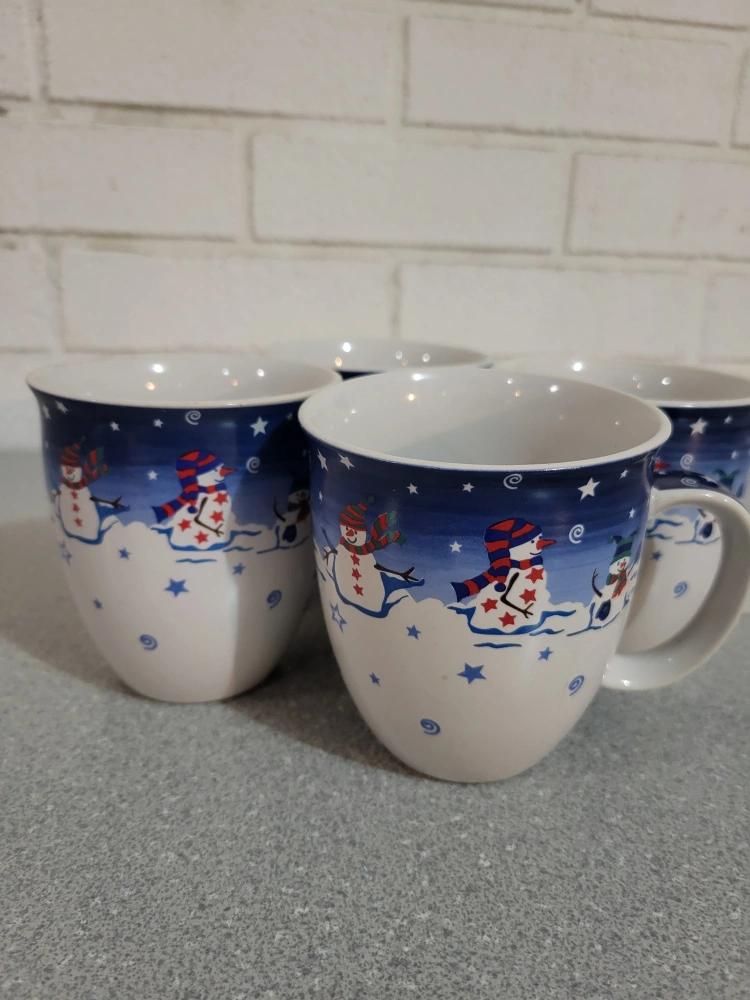 Here's a set of four mugs featuring a cute snowman design! They're perfect for enjoying hot beverages during the winter season. They look great and are in good condition!