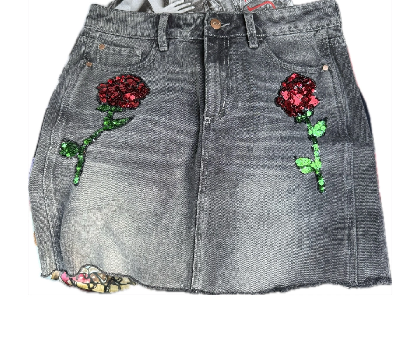 Cute denim skirt with rose embroidery! It's in 10/10 condition and ready for a new home. The denim has a nice grey wash, and the roses add a fun pop of colour with their red and green sequins.
