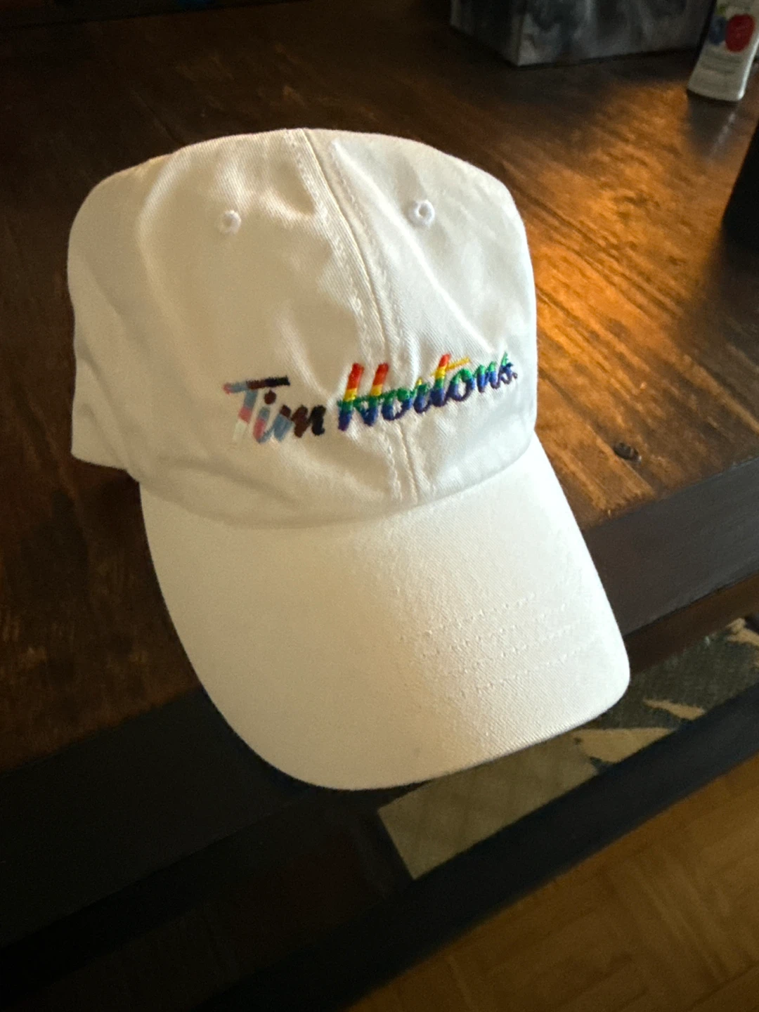Selling a Tim Hortons baseball cap! It's a classic white colour with the Tim Hortons logo in a rainbow design. Perfect for any Tim's fan!
