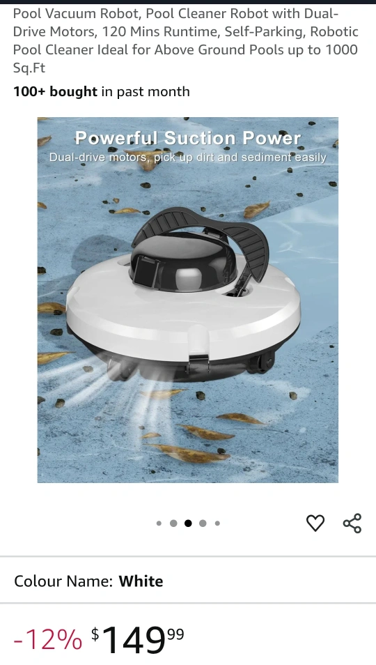Selling a white pool vacuum robot. It features dual-drive motors and is self-parking. It's ideal for above-ground pools up to 1000 sq ft. It has improved battery performance, offering up to 120 minutes of endurance. This robot is suitable for different flat bottom pools and provides cordless, efficient cleaning. It also has powerful suction and is ultra-portable, making it easy to retrieve and store. Originally bought for $149.99