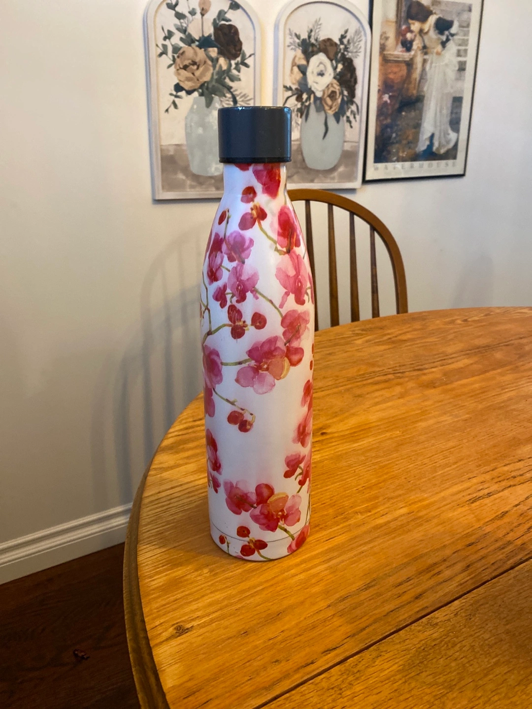 A lovely water bottle with a pretty floral design! It's perfect for staying hydrated on the go. The bottle is in great condition and ready for a new home
