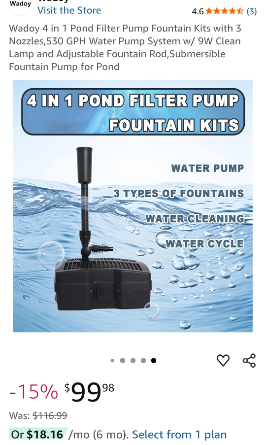Selling a Wadoy 4-in-1 pond filter pump fountain kit! It comes with 3 nozzles, a 530 GPH water pump system with a 9W clean lamp, and an adjustable fountain rod. It's also a submersible fountain pump for your pond!