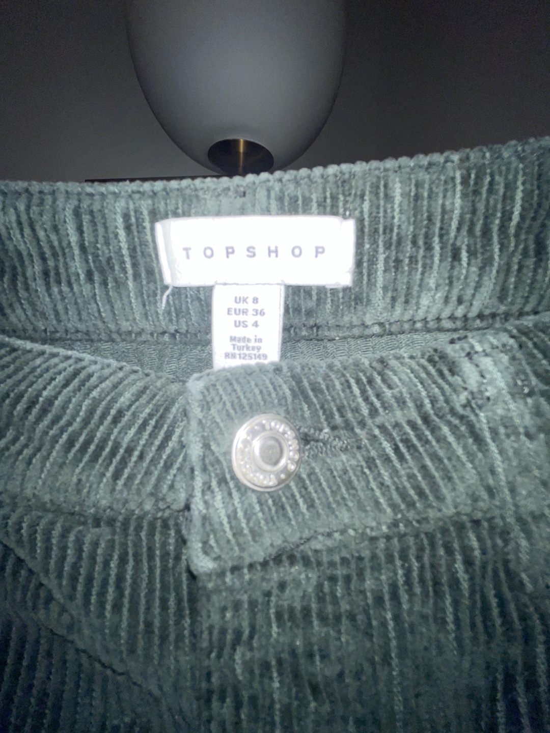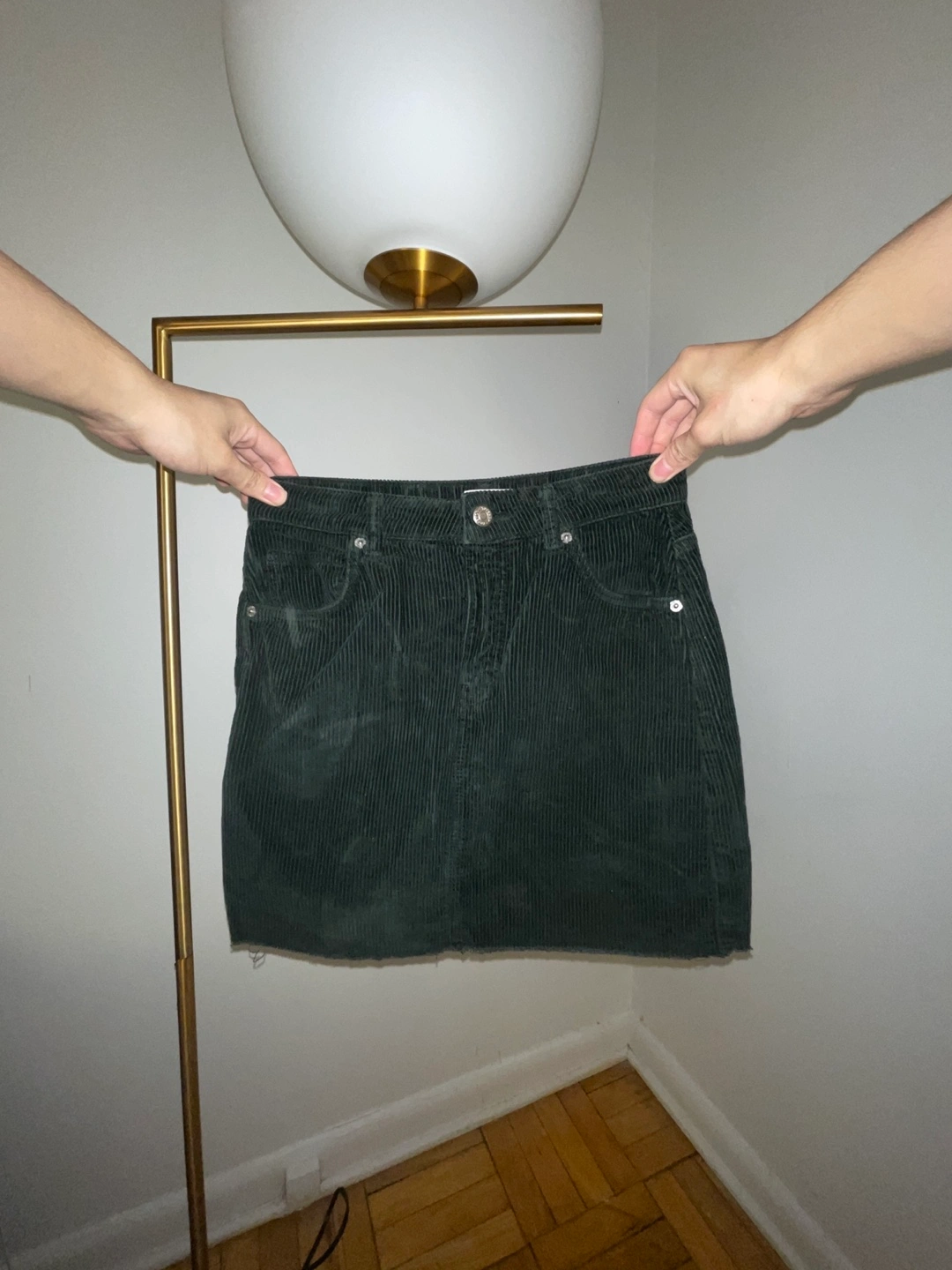 Selling a cute Topshop corduroy mini skirt in a lovely green colour! It's a US size 4 (UK 8, EUR 36). The material is soft and the style is super versatile.