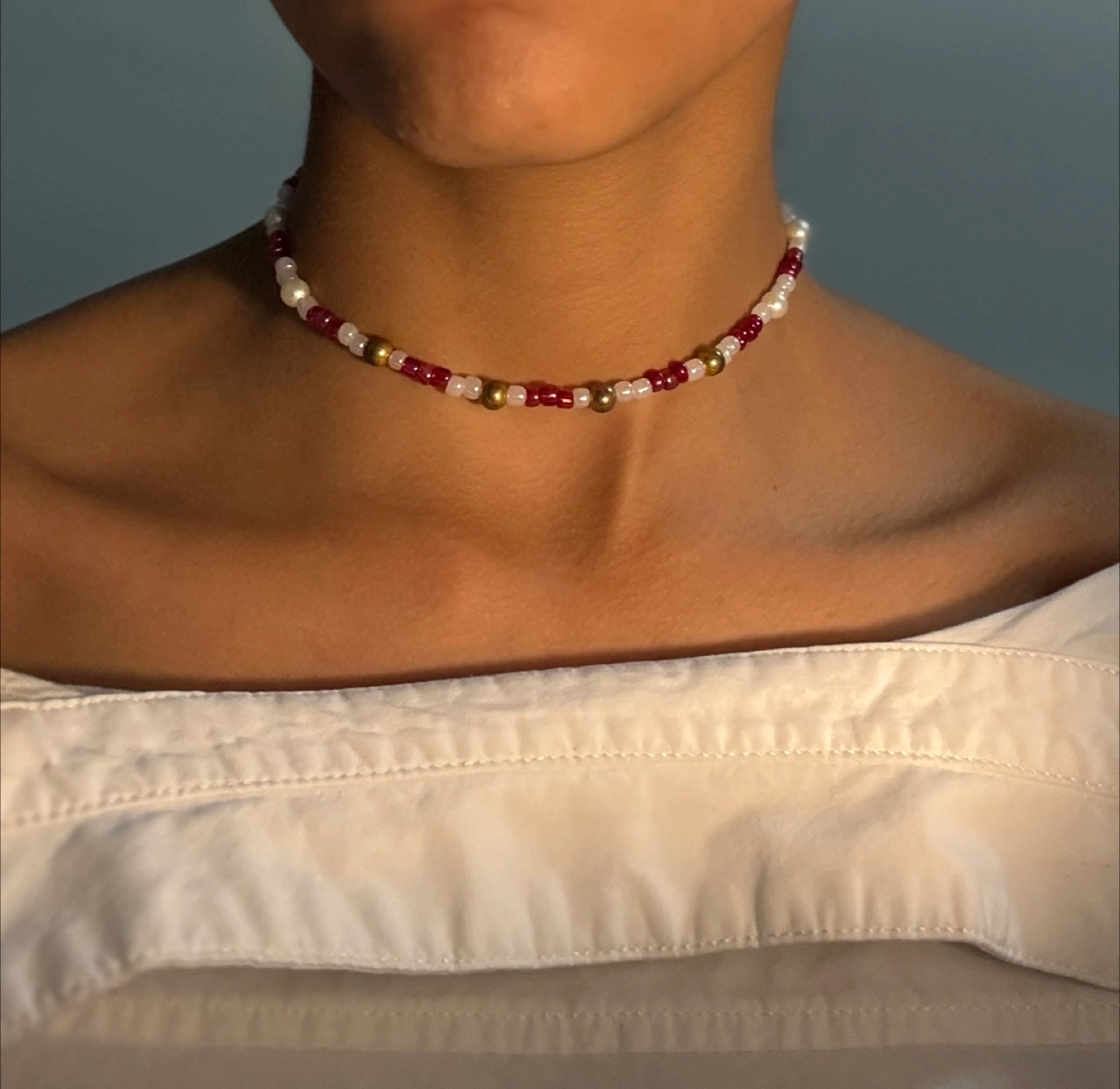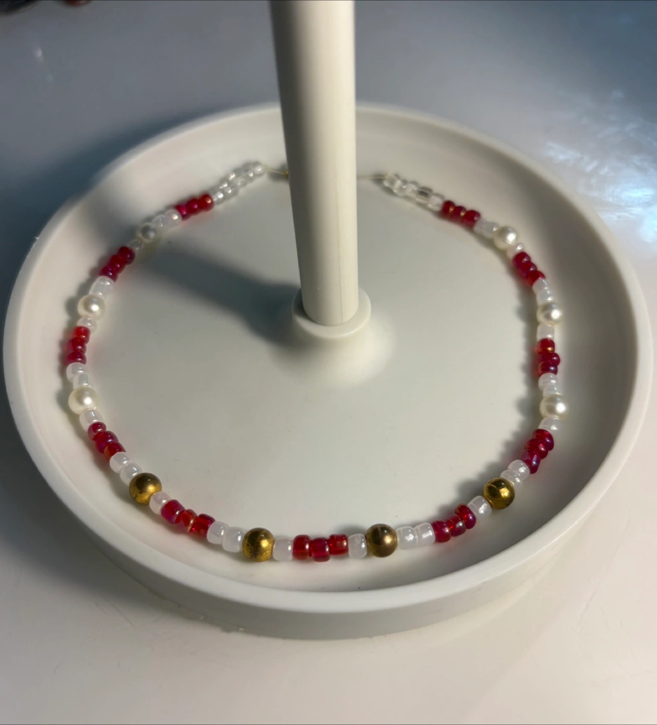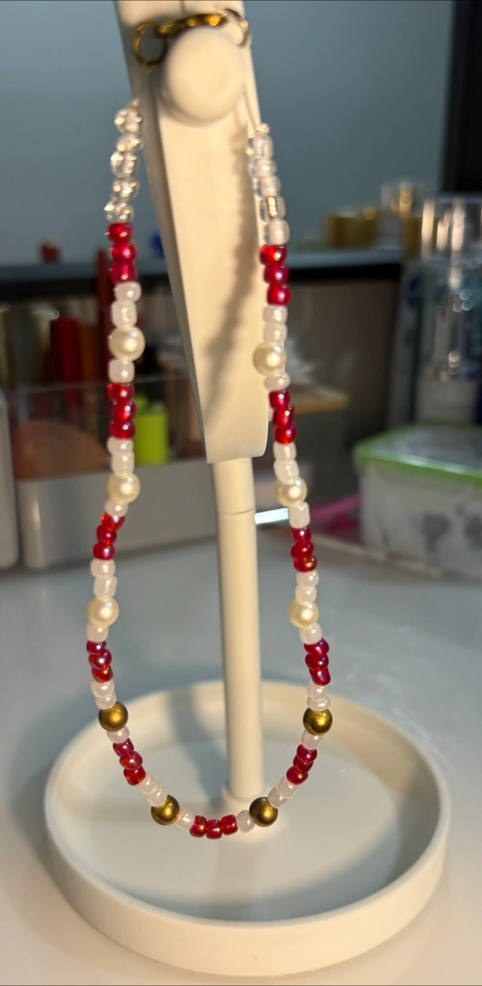 Selling a handmade beaded choker. It features a mix of red, white, and gold beads. It's in great condition and would be a lovely addition to any outfit