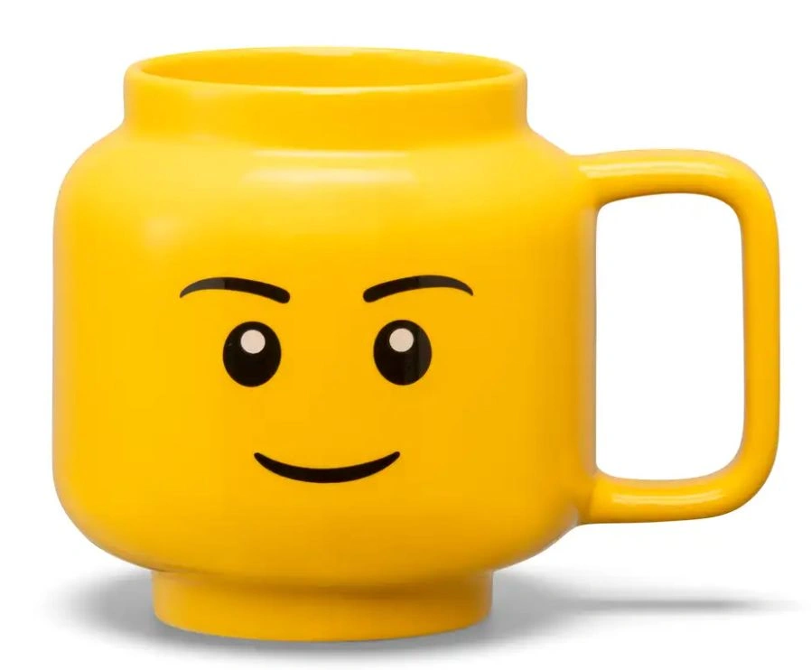 A fun LEGO mug shaped like a minifigure head! It's bright yellow and in great condition, perfect for any LEGO fan who wants to add a bit of whimsy to their morning coffee or tea/ use as a pen stand.