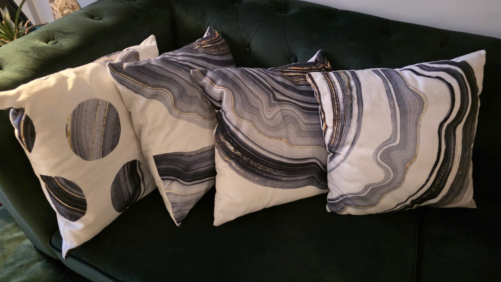 Selling a set of 4 decorative throw pillows. They feature a stylish pattern in shades of white, grey, and black with gold accents. size: 16"x16"