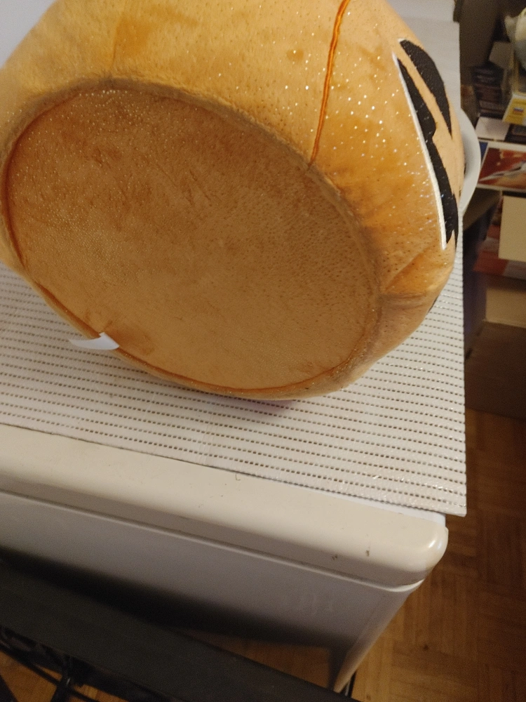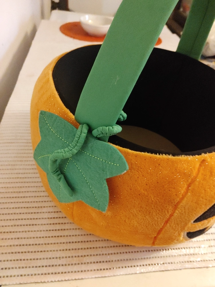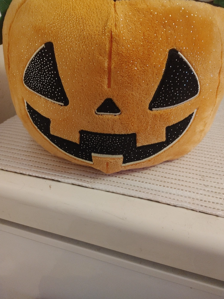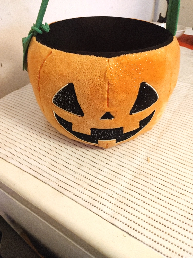 Here's a cute plush pumpkin candy bucket, perfect for Halloween! It's in great shape and ready for trick-or-treating or festive decor