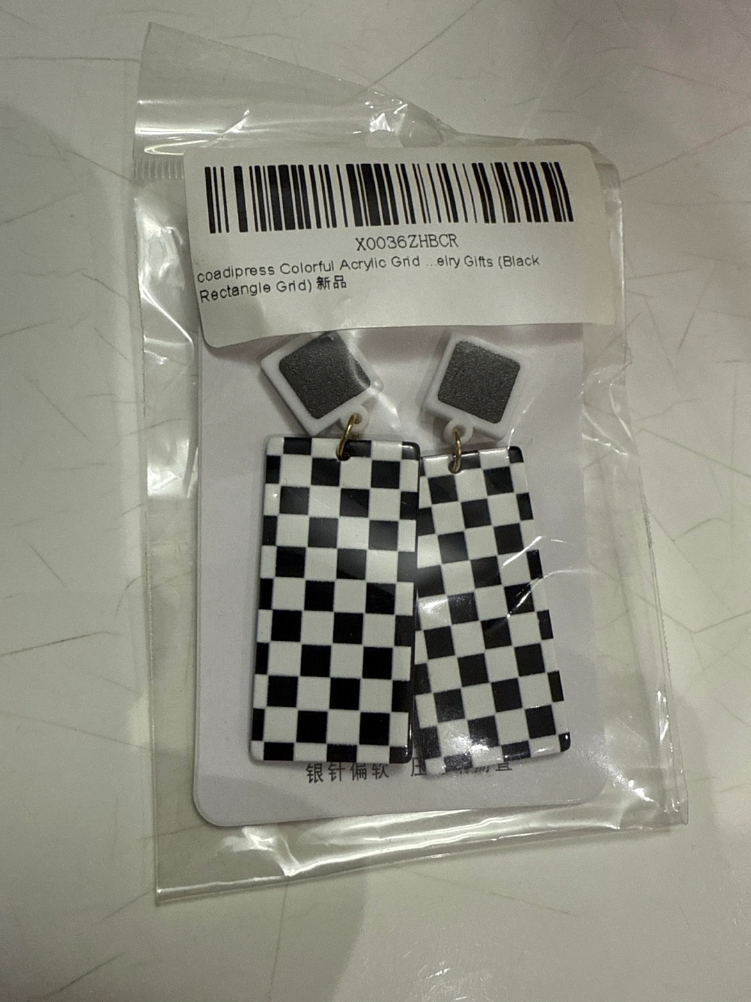 brand new pair of Coadipress earrings! These feature a fun black and white checkerboard design. They are acrylic and come in their original packaging