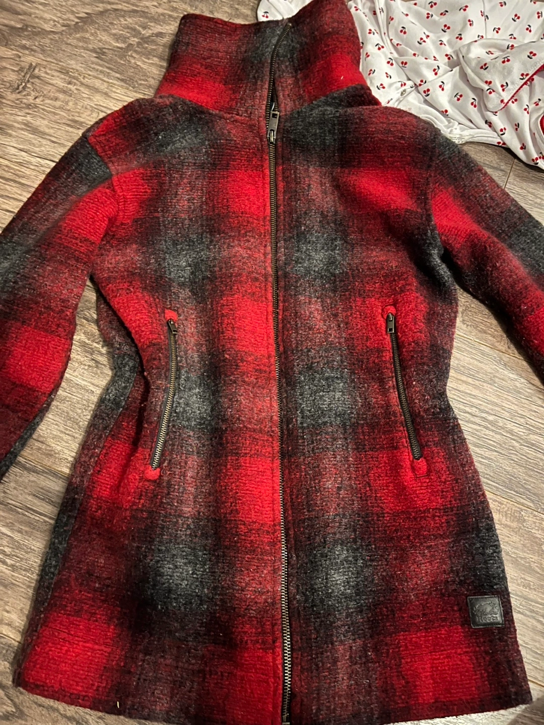 Roots Cabin Coat in size XS. The coat is red and black. Perfect for staying cozy this fall! There’s no damage, staining, or wearing out. Comes from a smoke free and pet free home