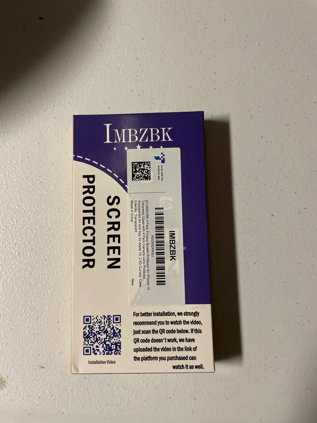 Selling a brand new IMBZBK 4-pack privacy screen protector for the iPhone 15. It includes tempered glass with 4 camera lens protectors, offering 9H anti-spy protection. Designed with a 2.5D curved edge, it's case-friendly and transparent. For easy installation, scan the QR code for a helpful video!