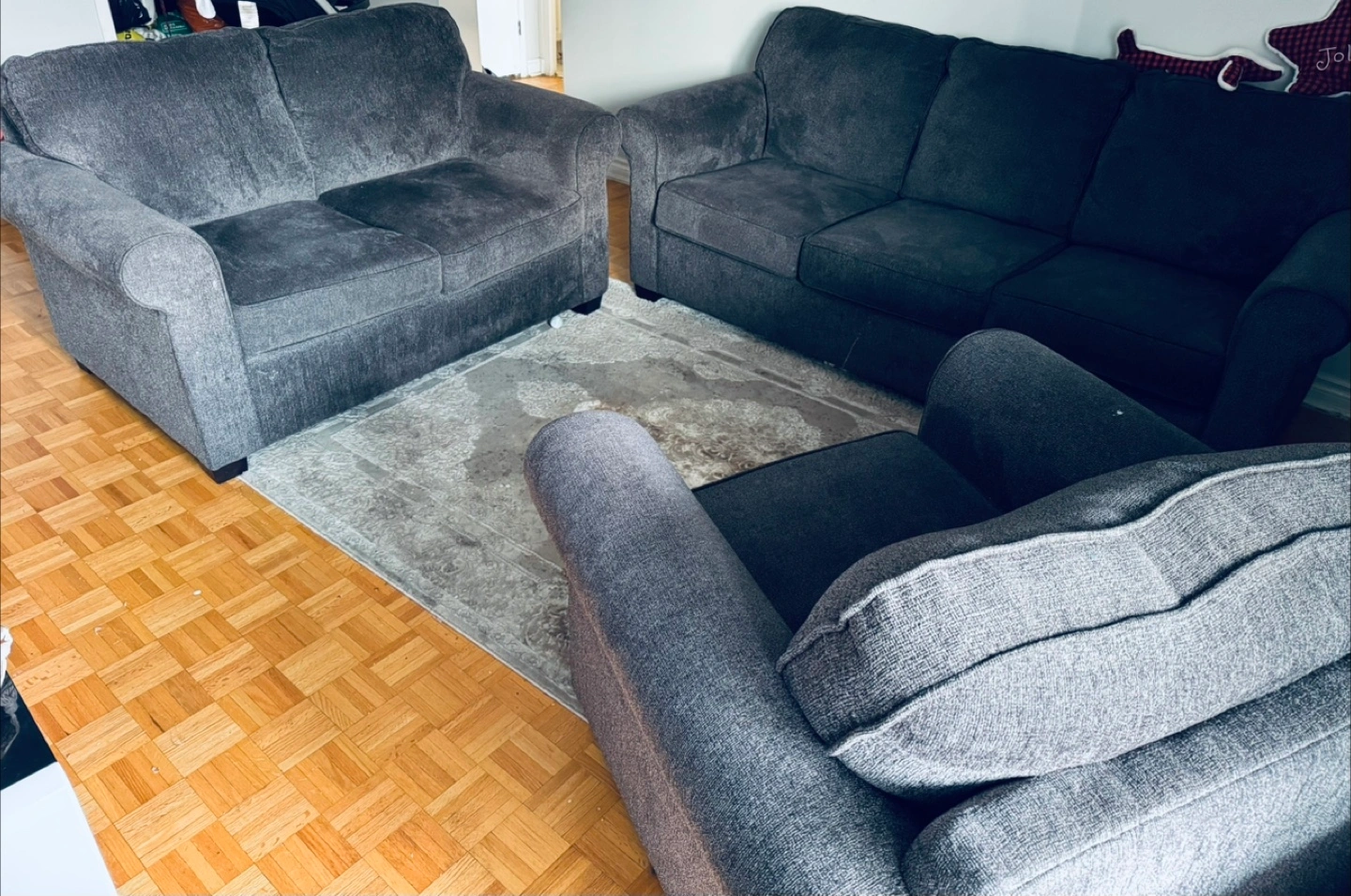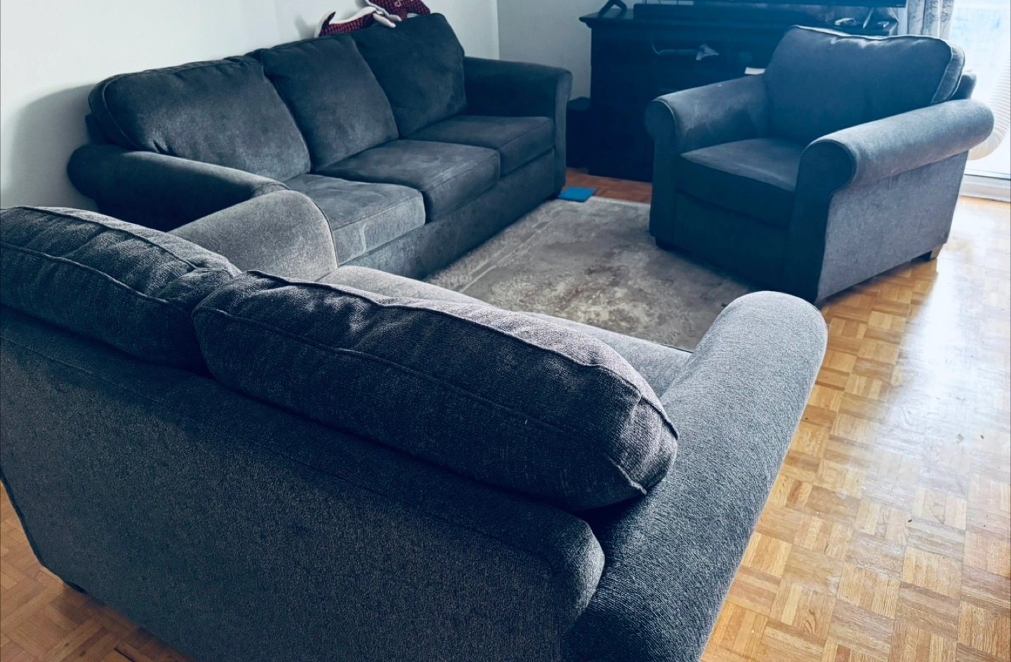 Selling a comfy grey sofa set that includes a loveseat, a sofa, and an armchair. It's in great shape and ready to add some cozy vibes to your place! The set is a matching collection, perfect for furnishing a living room or family space. It's a great opportunity to get a complete set at once