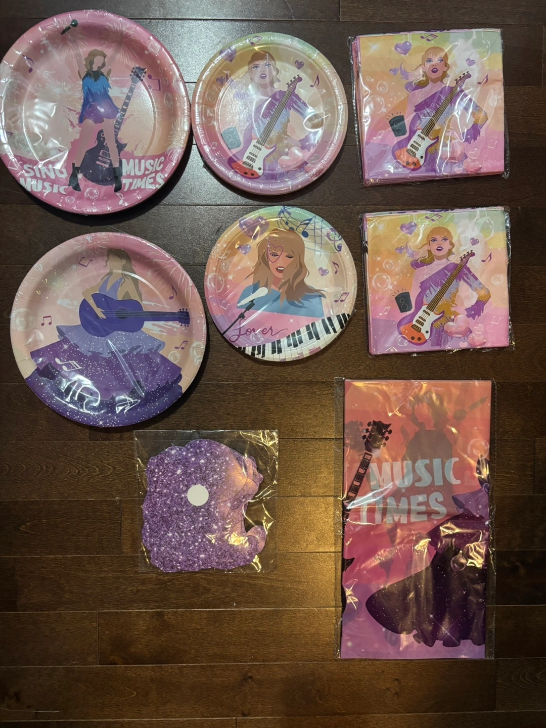 Get ready to celebrate with this Taylor Swift themed party set! It includes plates, napkins, and other decorations to make your party a hit with any Swiftie
