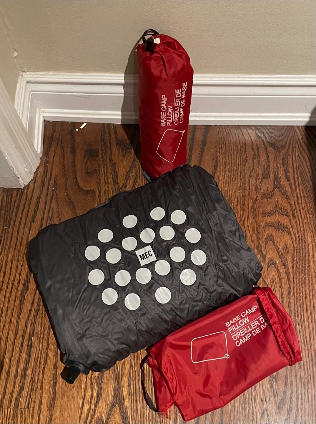 Offering one MEC Base Camp Pillows. It has padding and can inflate if repaired. The side has a small split. It comes with its original stuff sack for easy packing and storage.