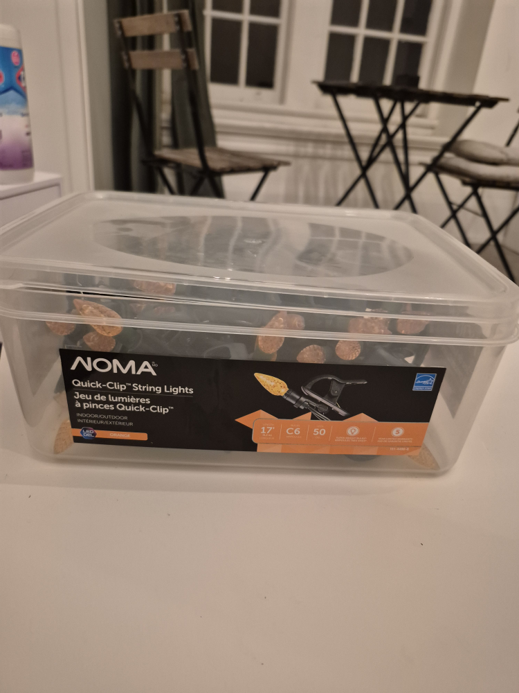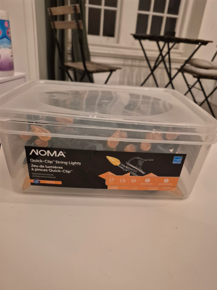 Selling a set of NOMA Quick-Clip String Lights. They are suitable for both indoor and outdoor use. The string is 17 feet long and features C6 bulbs. Includes 50 lights