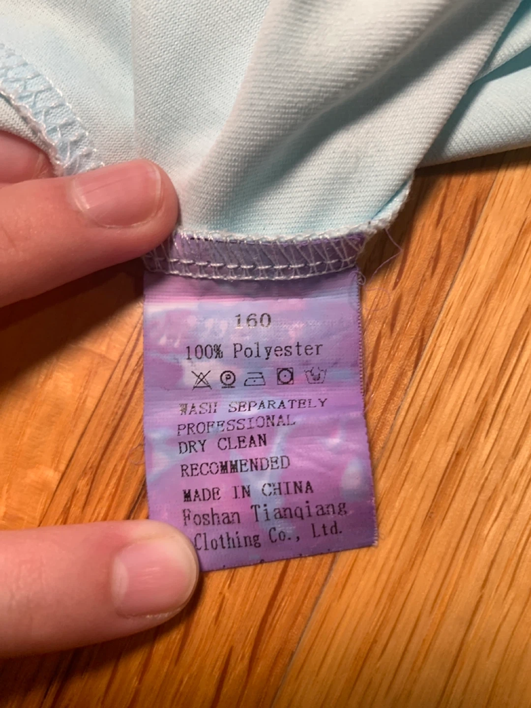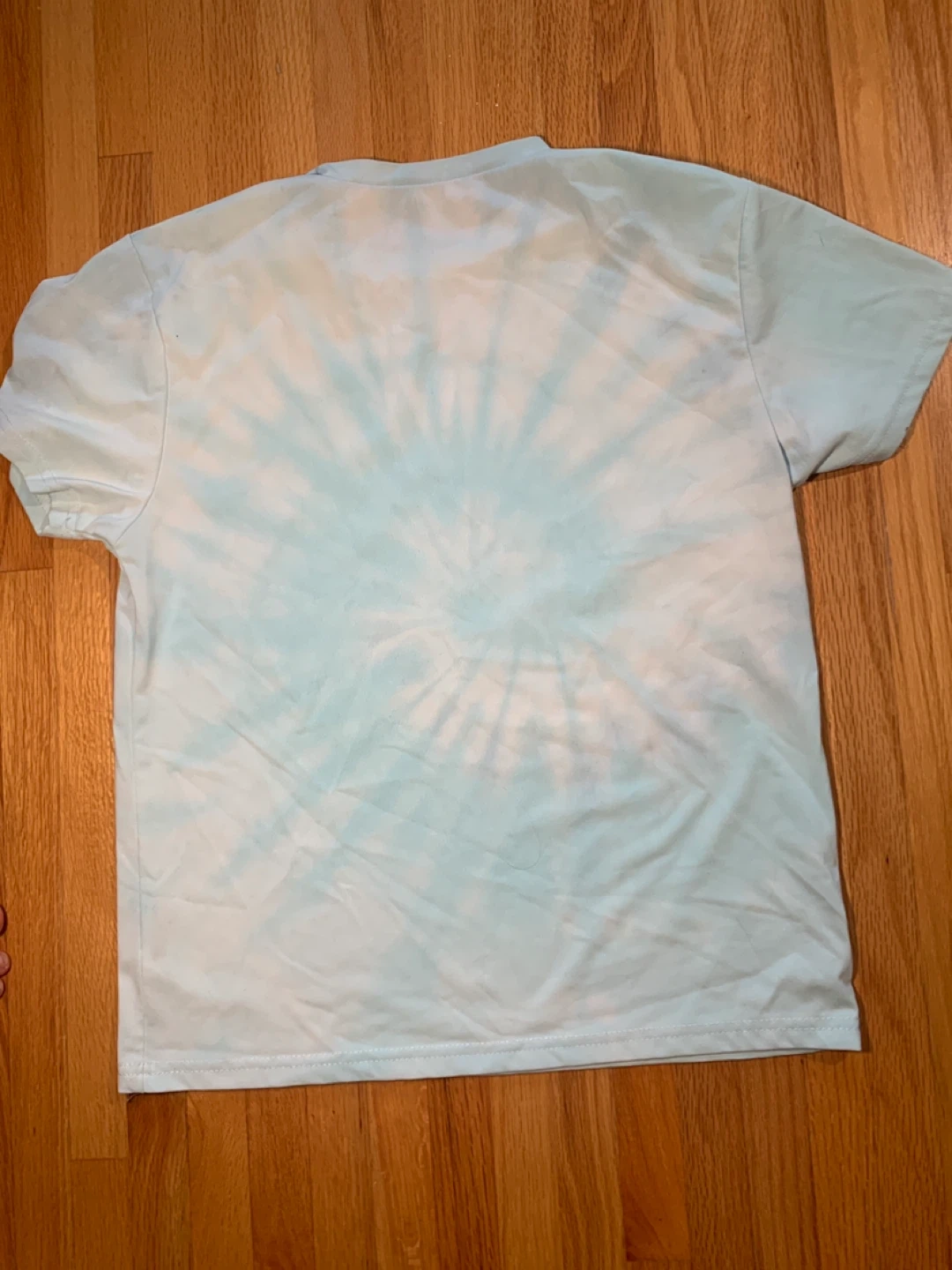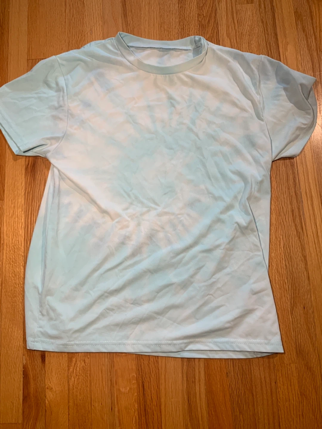 10Selling a light blue tie-dye t-shirt in great condition! The tag indicates it's made of 100% polyester and is size 160. It's recommended to wash separately and dry clean.