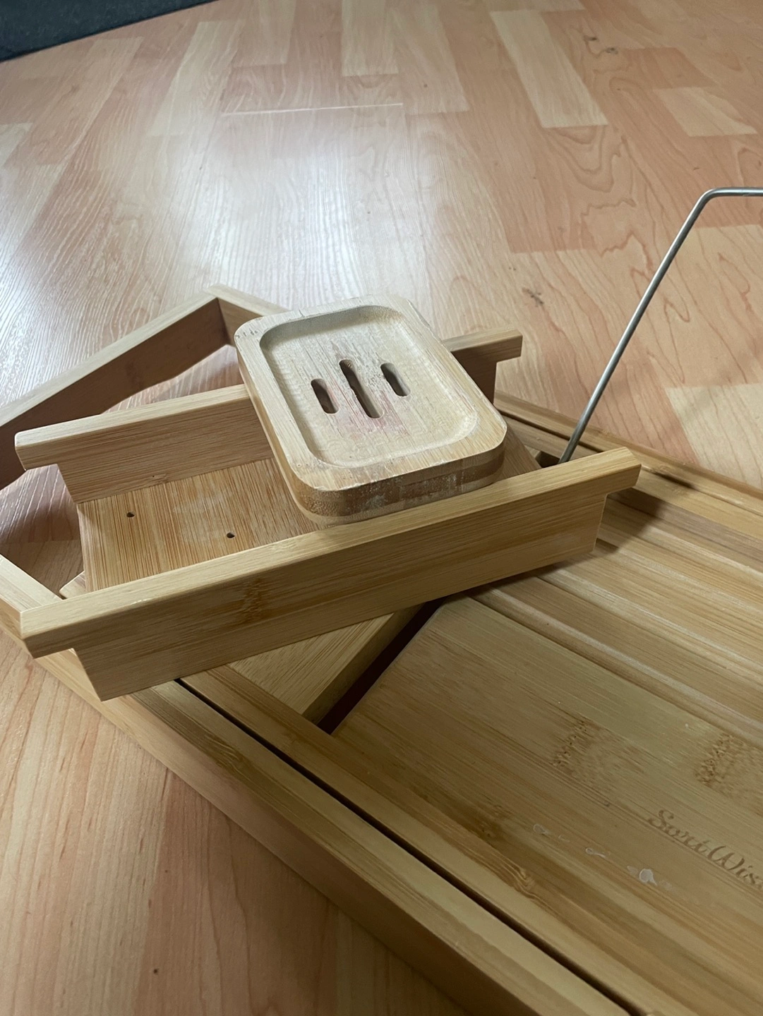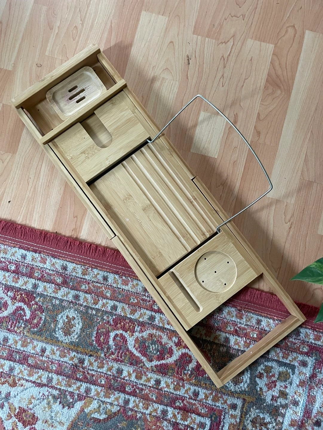 Has room for a candle, glass of wine, book or ipad bar and a slot for your iphone so you can be hands free.