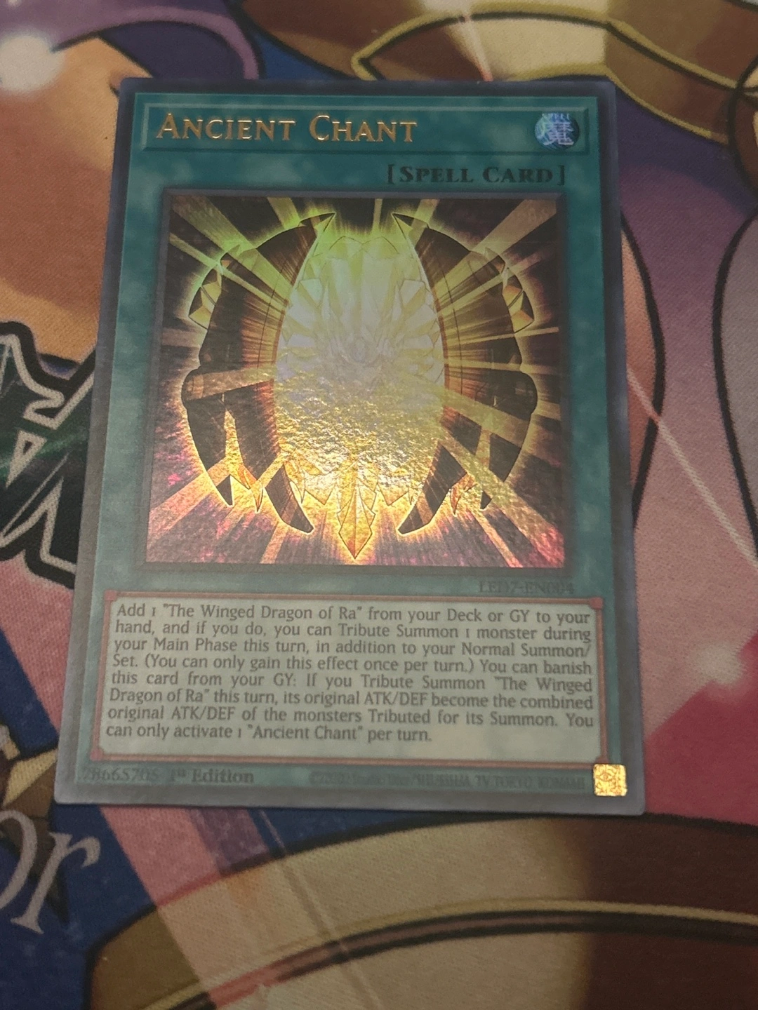 Selling a Yu-Gi-Oh! card: Ancient Chant. It's a spell card from the 1st Edition. Add "The Winged Dragon of Ra" from your Deck or GY to your hand with this card!