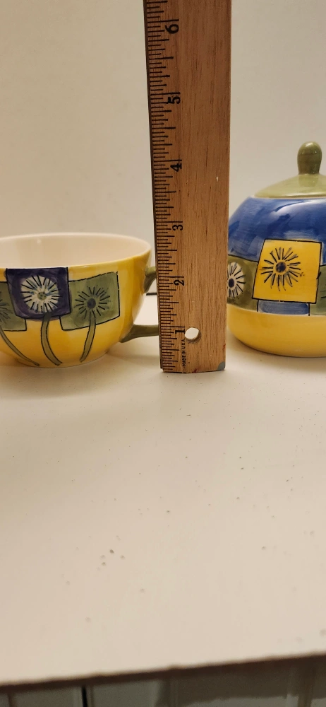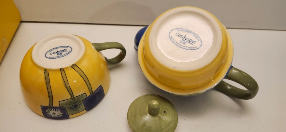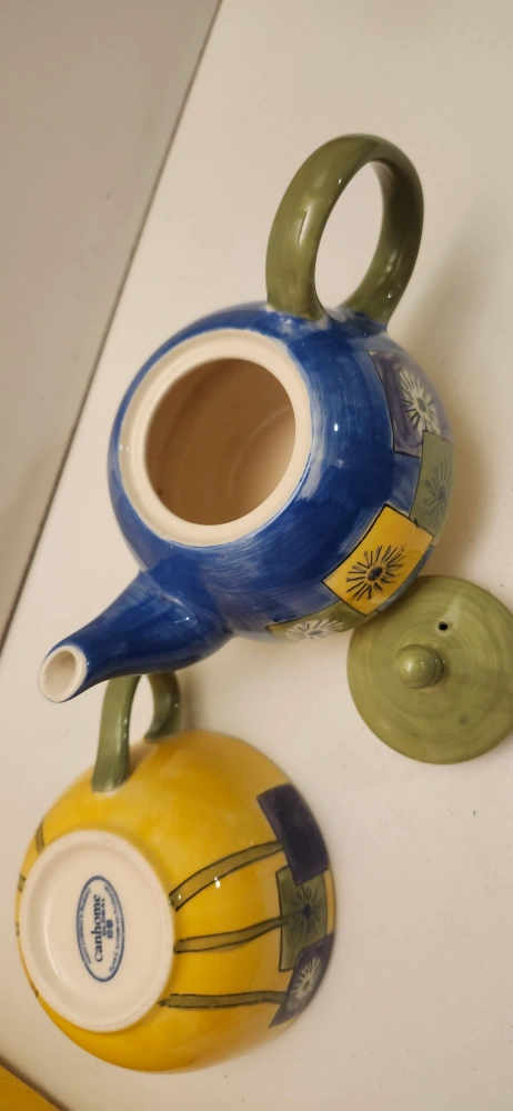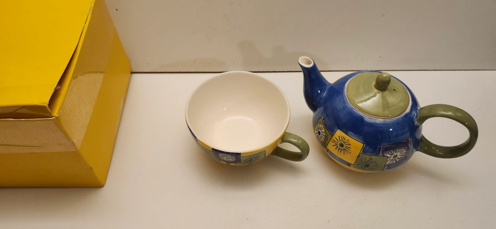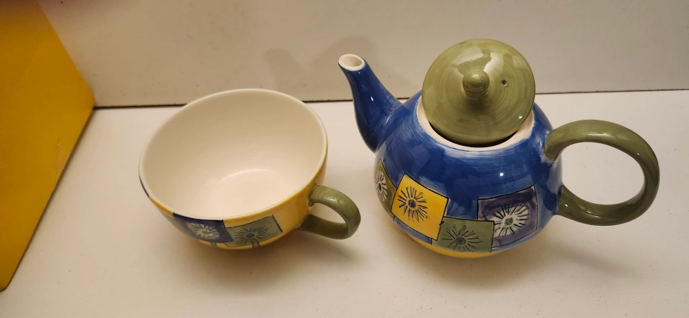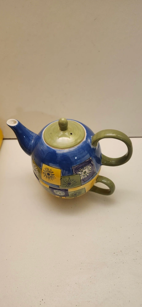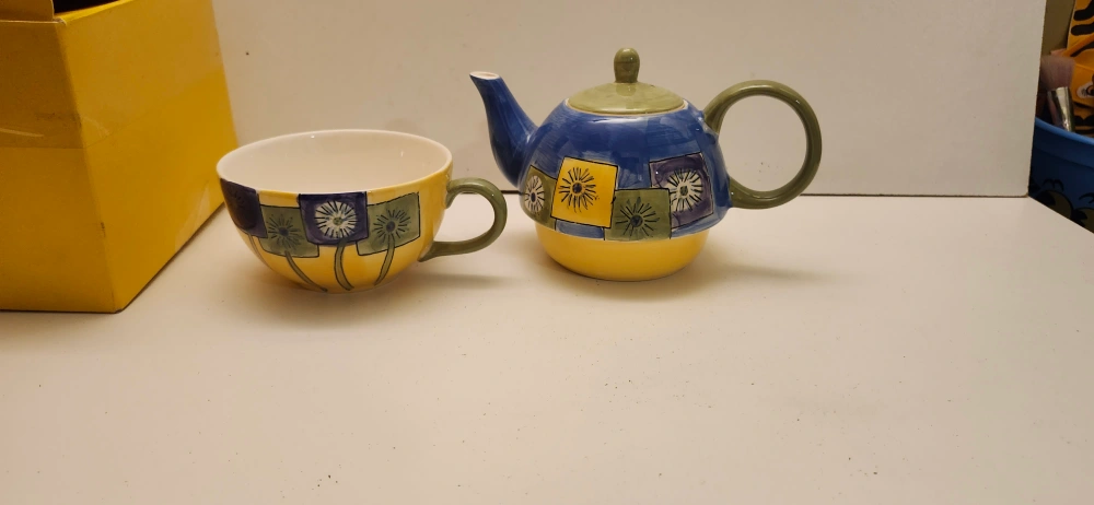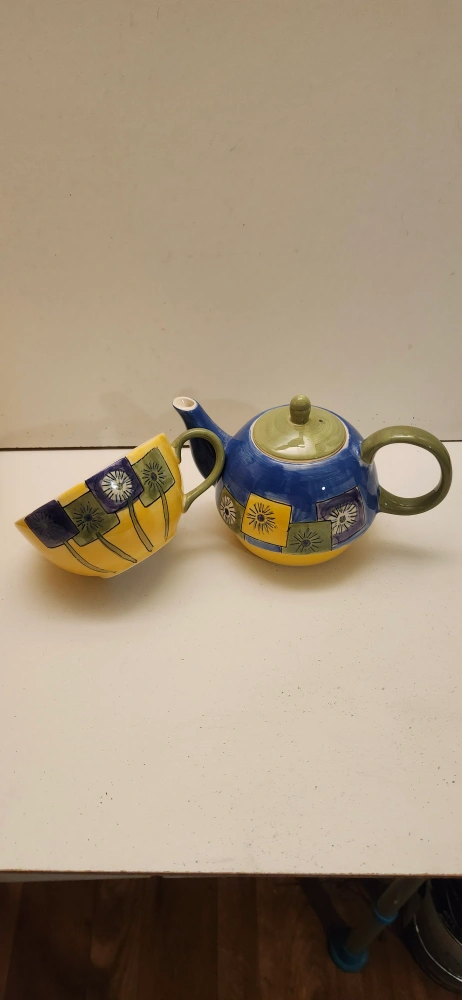 Here's a lovely teapot and cup set! It features a charming design with blue, yellow, and green colours. Perfect for adding a touch of whimsy to your tea time .price only cash only pickup no delivery. Meet up on 801 O'Connor drive outside TD Canada Trust bank door. East York