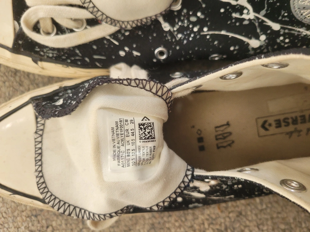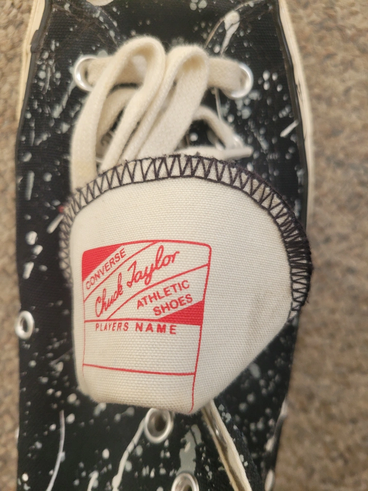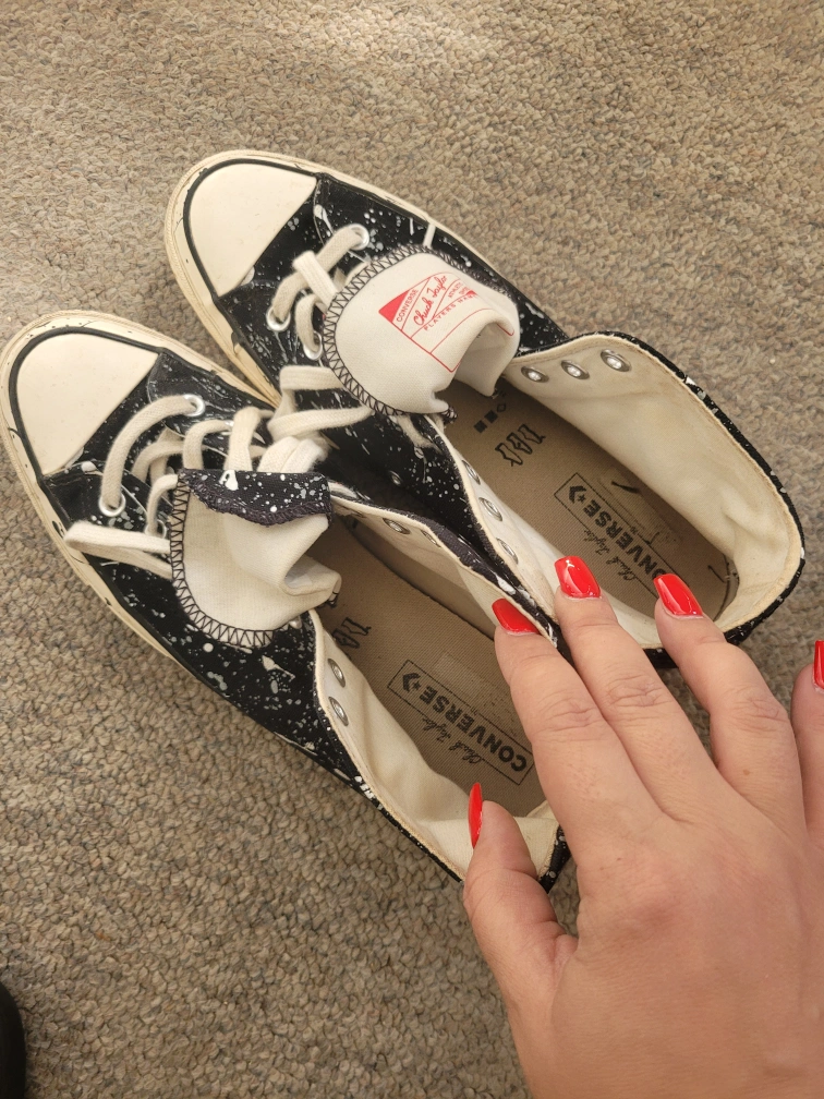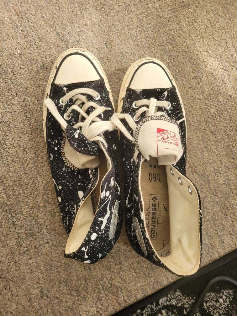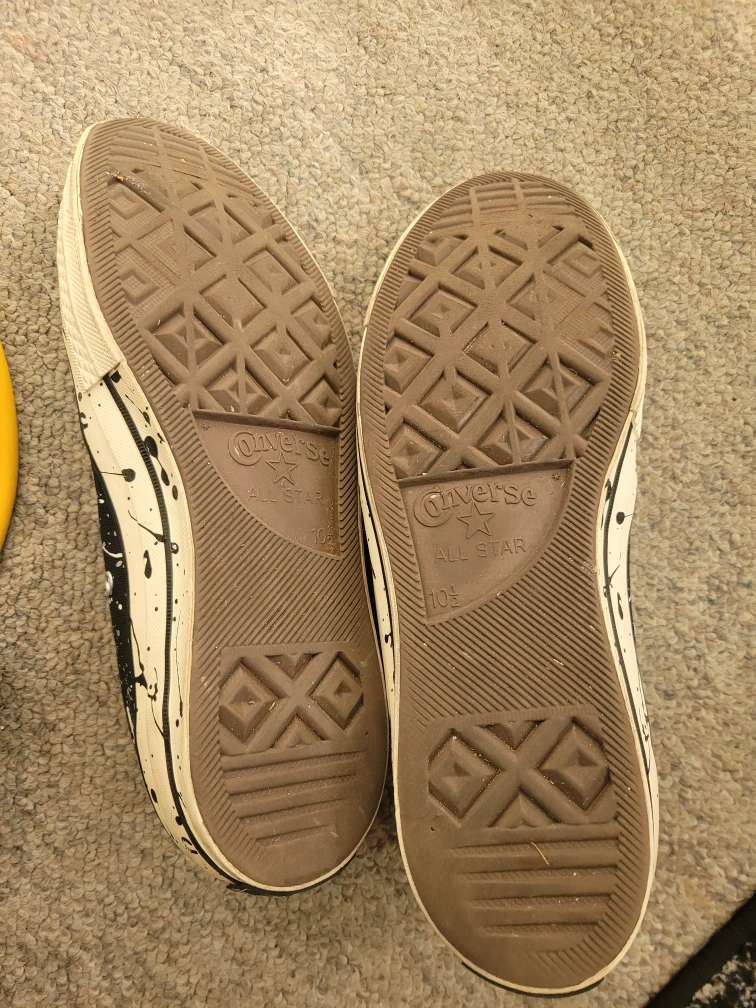 Selling a pair of Converse Chuck Taylor All Star high tops in size 10.5! These have a cool black and white splatter design. They're in good condition and ready for a new home!