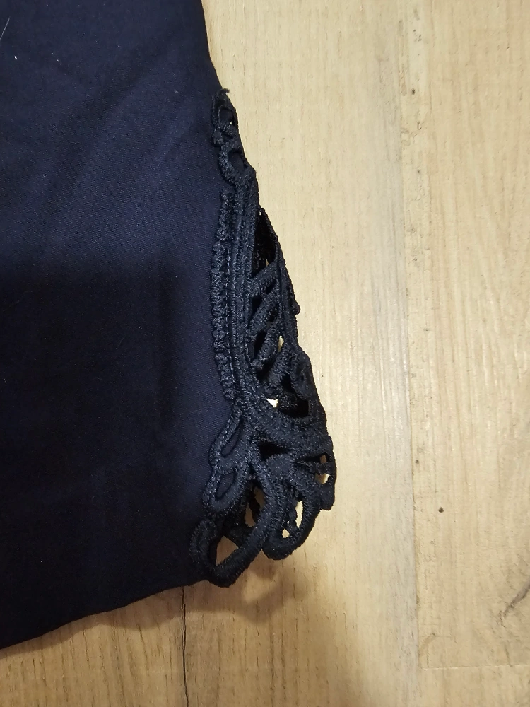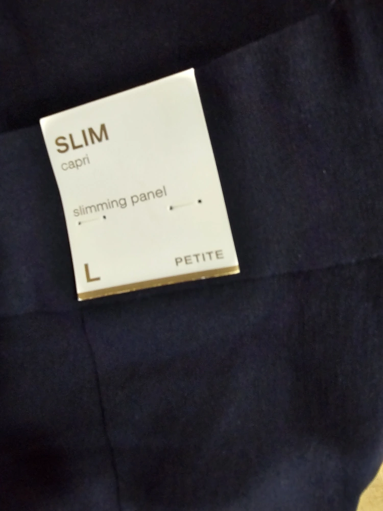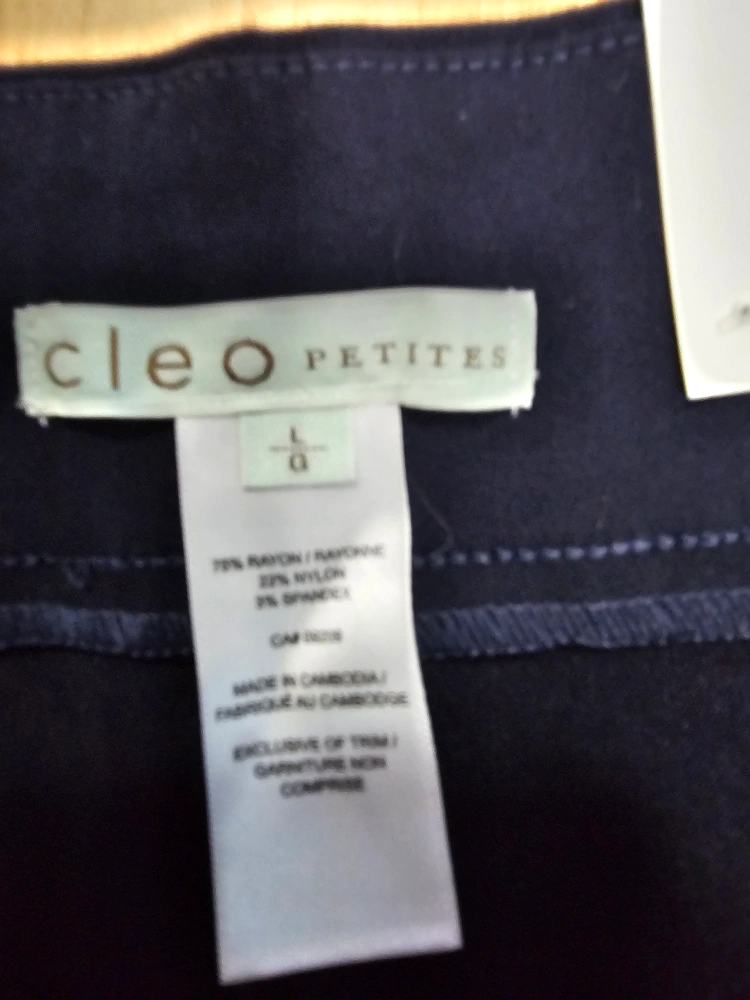 These are a pair of Cleo Petites slim capri pants in size L. They're a lovely navy blue colour with a cute lace detail at the hem. The material is 76% rayon, 22% nylon, and 2% spandex, so they're nice and stretchy!