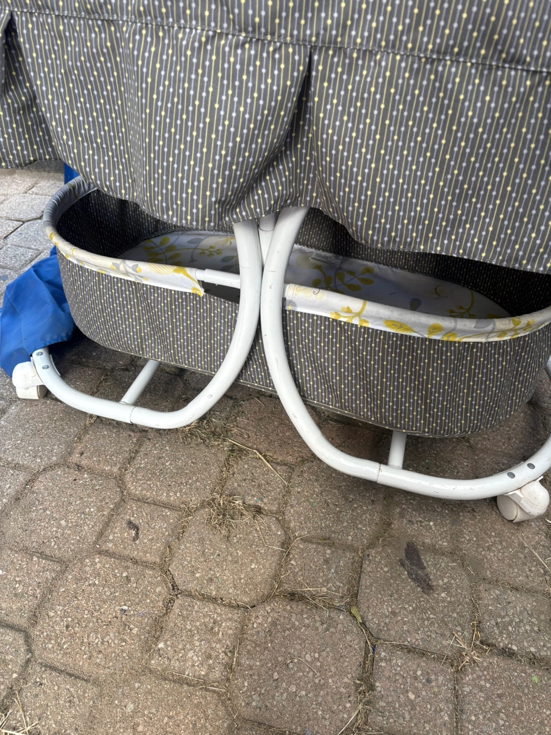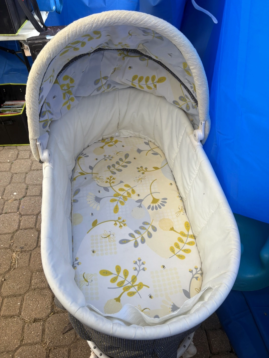 Selling a baby bassinet in good condition! It has a cute pattern. It's perfect for newborns and infants, providing a cozy and safe sleeping space. Also has a basket under neath for extras blankets, diapers etc