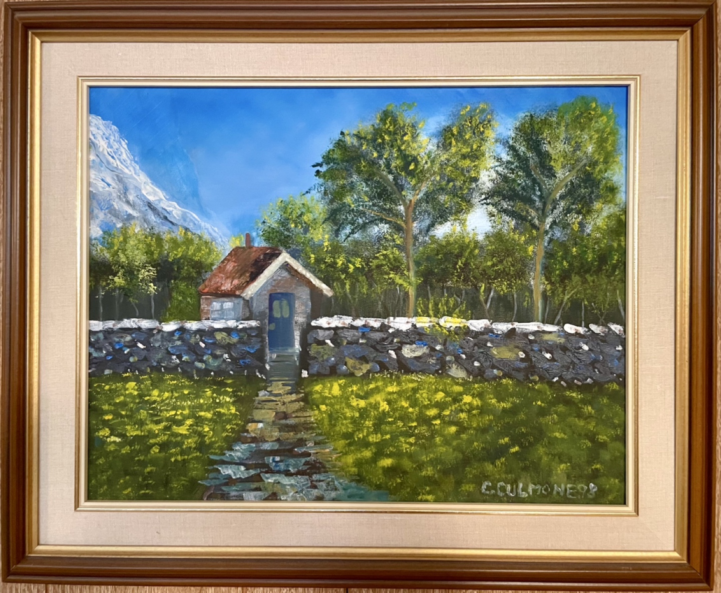 This framed impressionist style painting features a small, traditional cottage with a red roof and blue door. A stone wall in the foreground separates the cottage and a path from a grassy area with yellow flowers. Trees with green foliage stand behind the cottage and wall. A mountain or hill stands in the background on the left side.