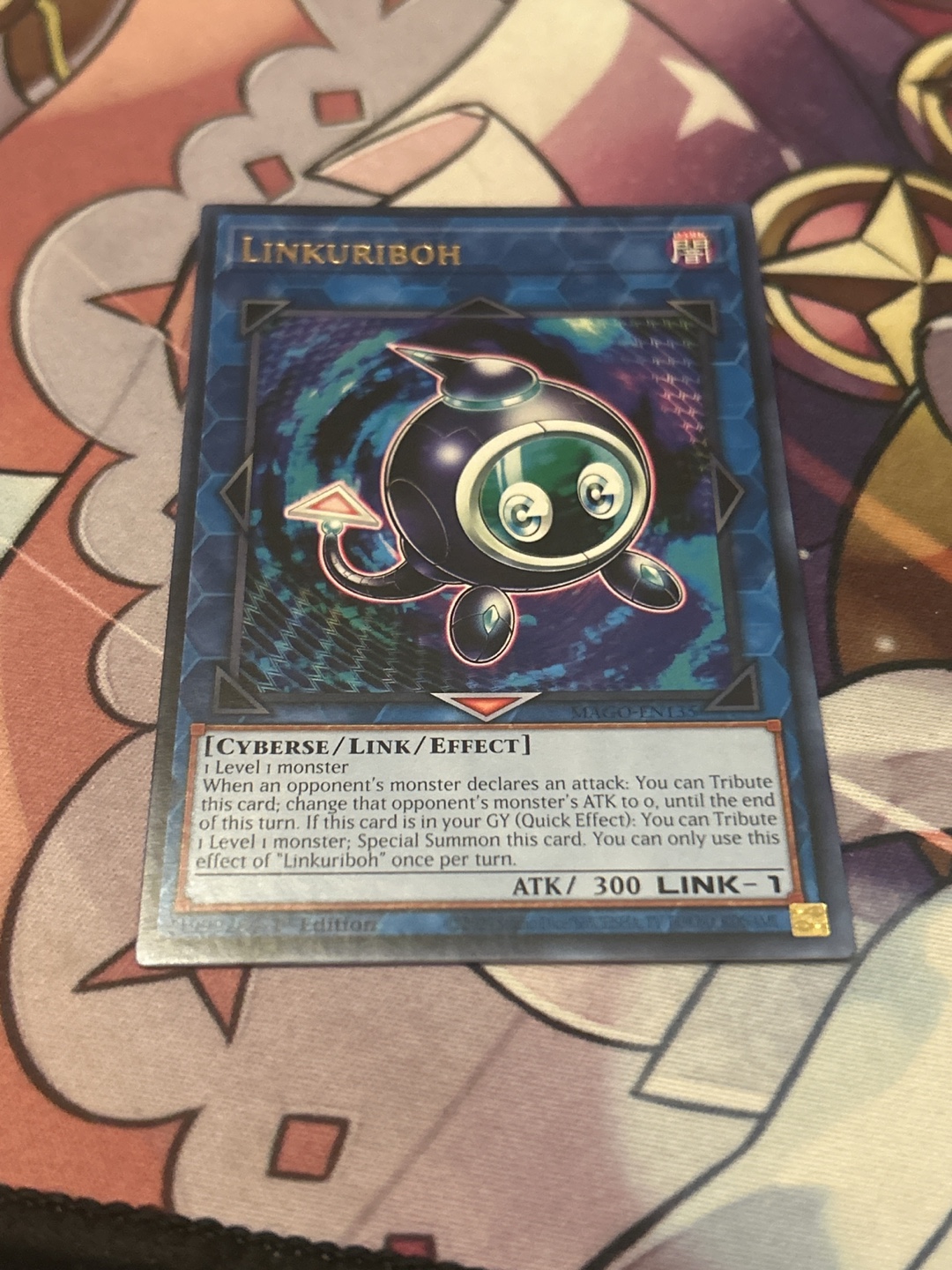 Selling a Linkuriboh Yu-Gi-Oh! card. It's a Cyberse/Link/Effect monster. When an opponent's monster declares an attack, you can tribute this card to change that opponent's monster's ATK to 0 until the end of the turn. It has an ATK of 300 and a Link-1 rating