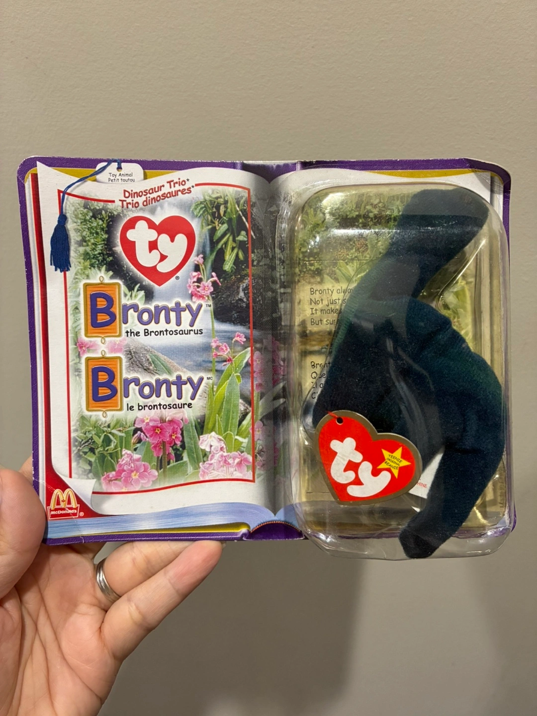 Ty Bronty Beanie Baby from the Dinosaur Trio collection, released in 2000. It's still sealed in its original packaging : )