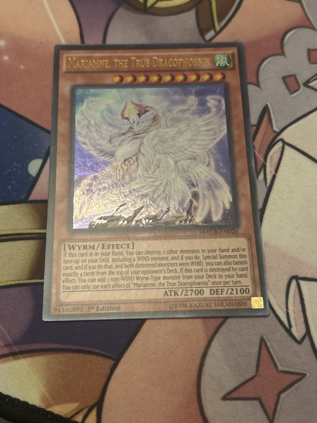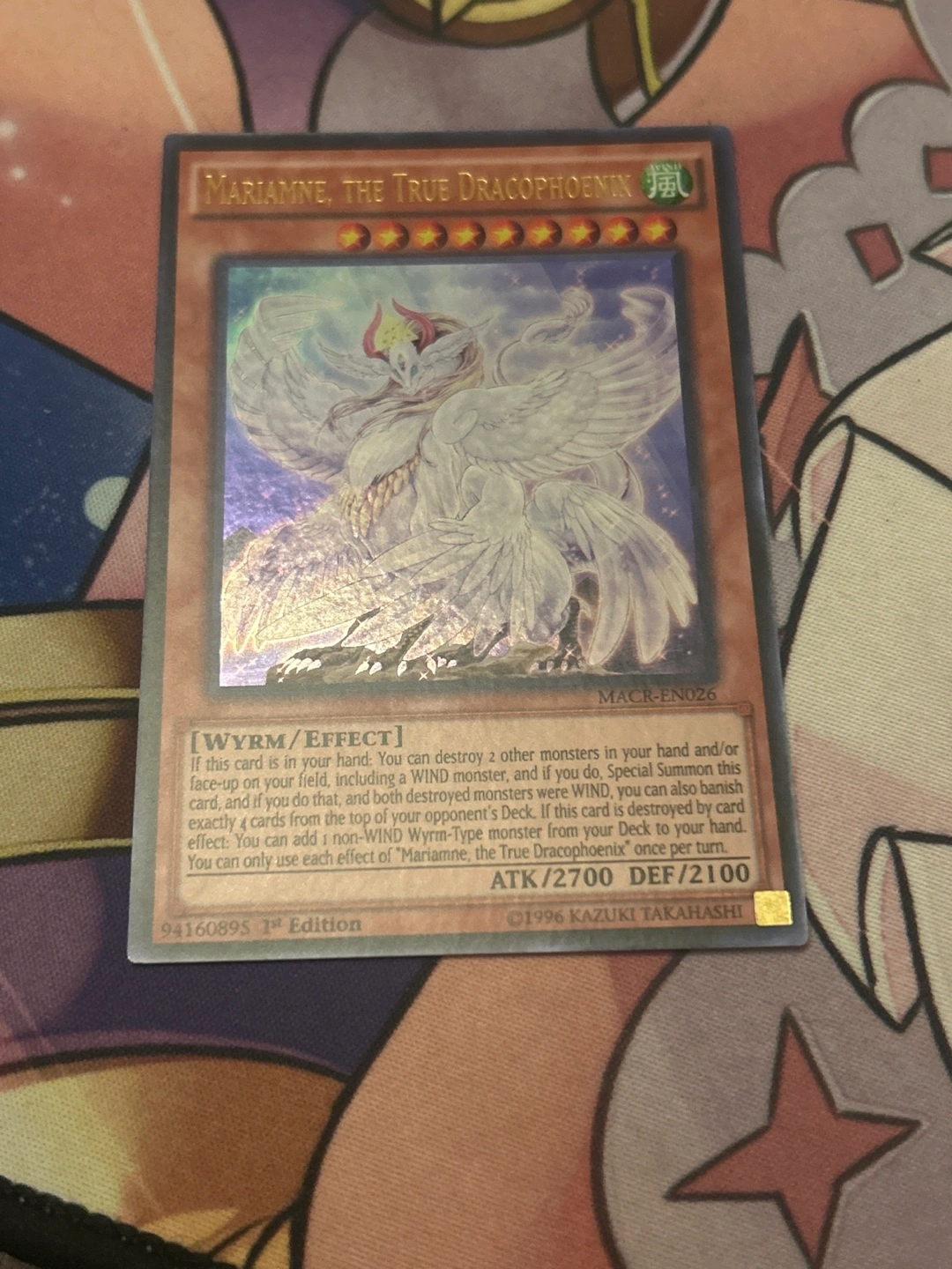 Selling a Mariamne, the True Dracophoenix Yu-Gi-Oh! card. It's a Wyrm/Effect monster with 2700 ATK and 2100 DEF. If this card is in your hand, you can destroy 2 other monsters in your hand and/or face-up on your field, including a WIND monster, and if you do, Special Summon this card. First Edition