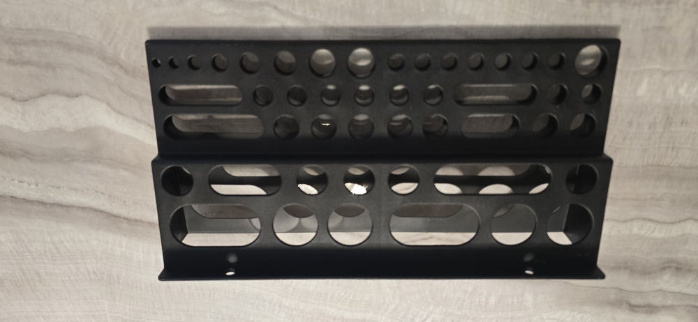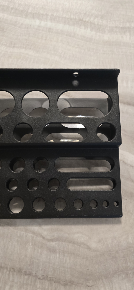 I'm selling a black metal tool organizer. It has various sized holes and slots for holding different tools. It's in great shape and ready to help you keep your workspace tidy