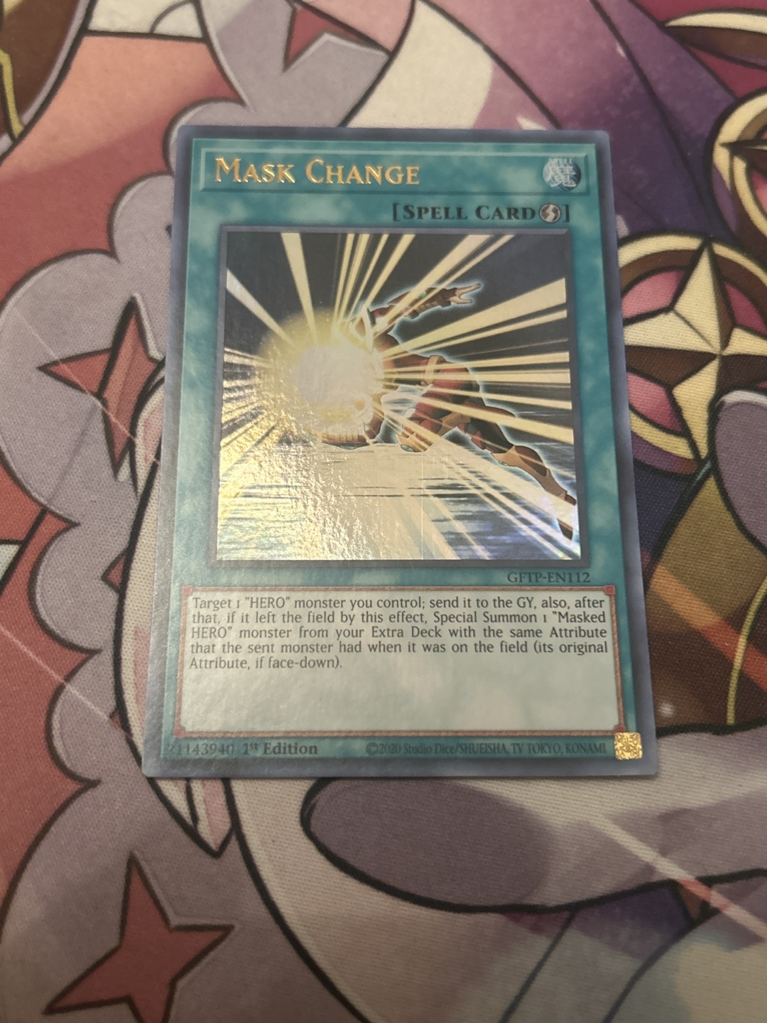 Selling a Yu-Gi-Oh! Mask Change spell card. It's in great condition and ready for a new duelist! This is a first edition card from 2020.