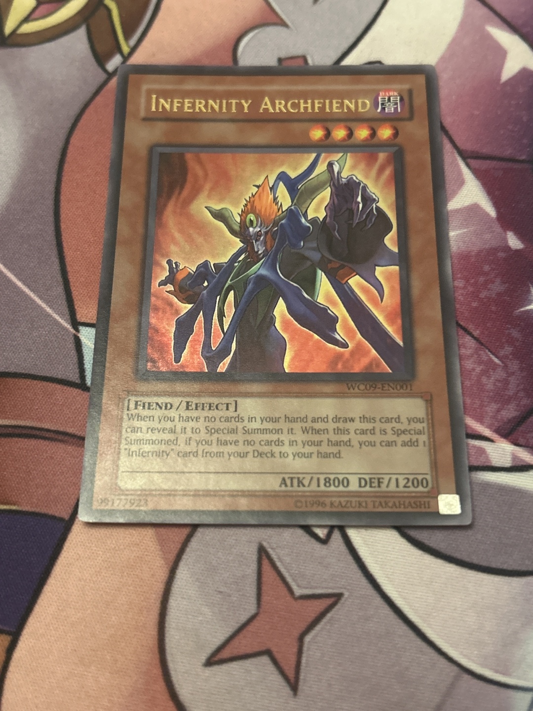 Selling an Infernity Archfiend Yu-Gi-Oh! card. It's a Fiend/Effect monster card with ATK/1800 and DEF/1200. When you have no cards in your hand and draw this card, you can reveal it to Special Summon it. When this card is Special Summoned, if you have no cards in your hand, you can add 1 "Infernity" card from your Deck to your hand. Great for any Yu-Gi-Oh! collector!