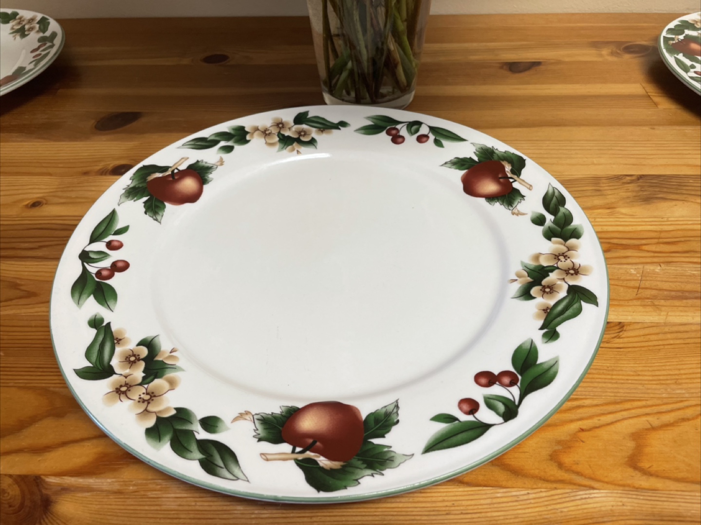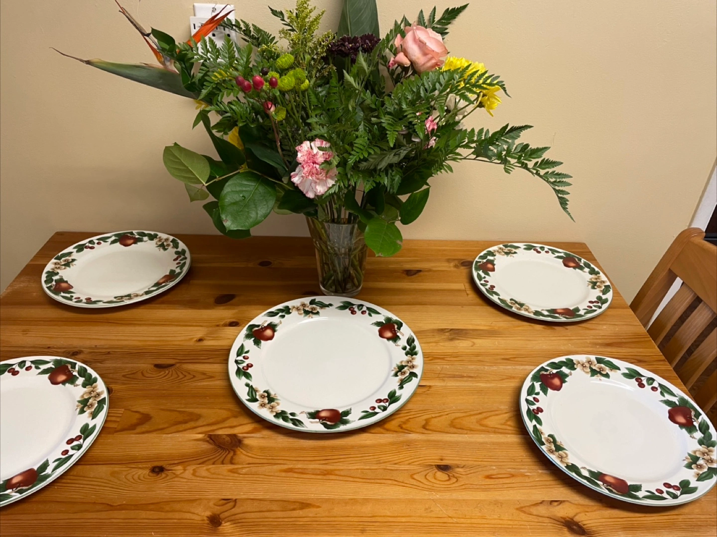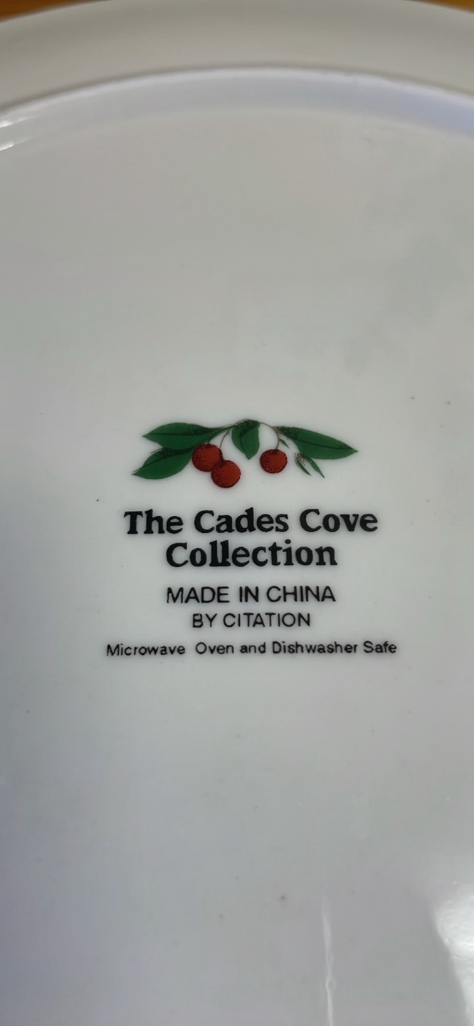 Selling a set of 5 plates from The Cades Cove Collection by Citation. These plates are microwave oven and dishwasher safe and feature a lovely apple and floral design around the rim. They're perfect for adding a touch of charm to your dining table!