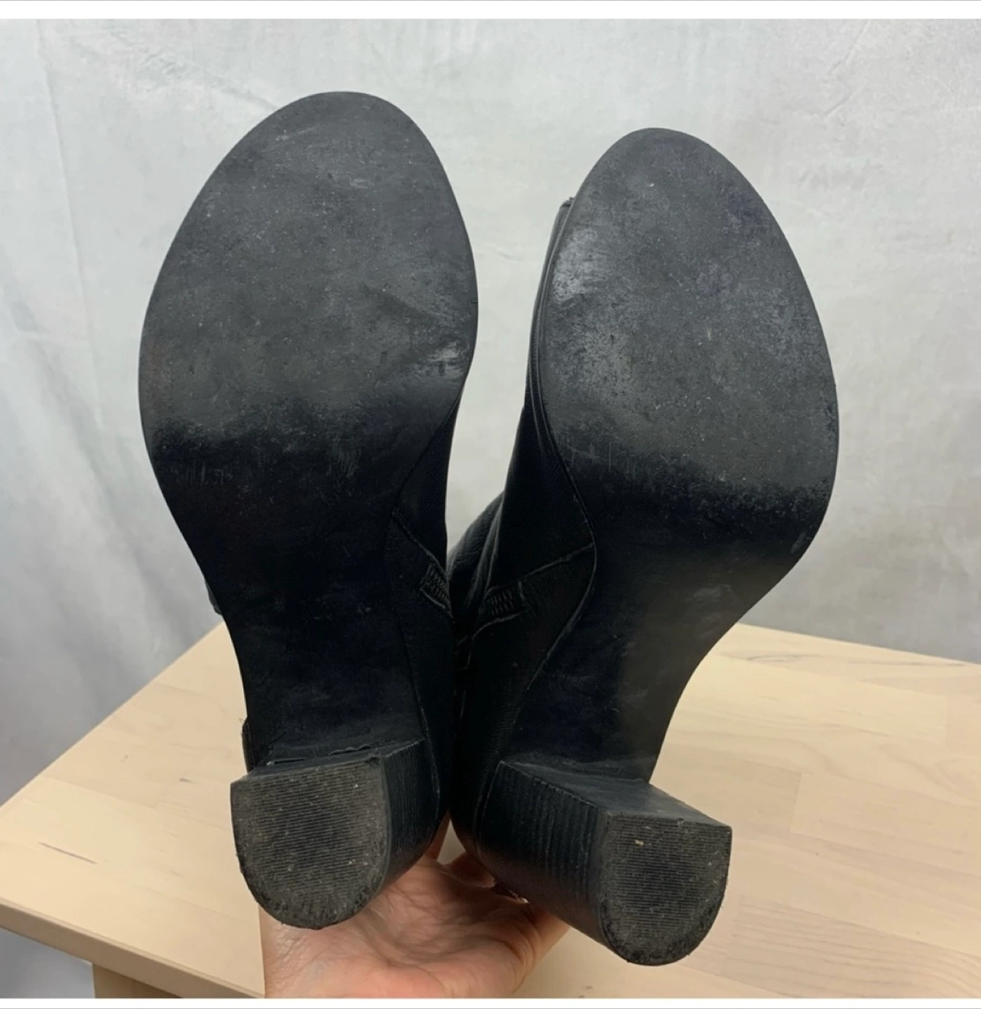 Selling a pair of Steve Madden Nextstar peep toe booties in size 7.5. They are black leather with a block heel and buckle detail. The upper is leather and the outsole is man-made.