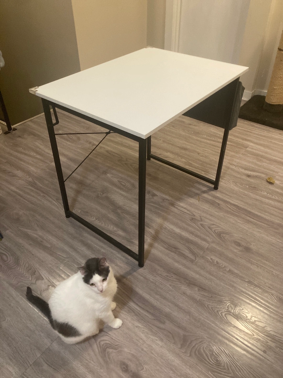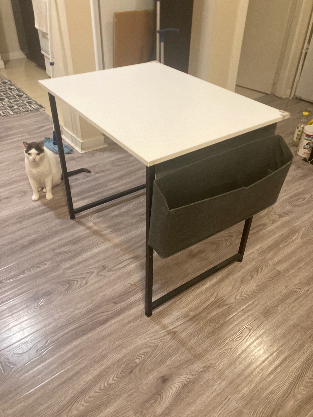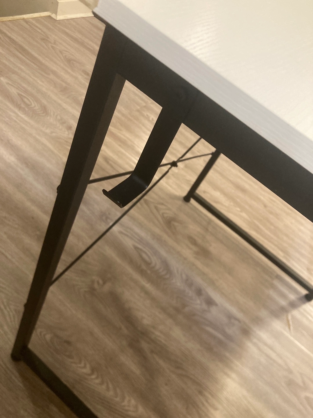 Selling a computer/study desk with a white top and black metal frame. It features a storage pouch and a hook for your headphones, as well as an "X" structure for added stability.
