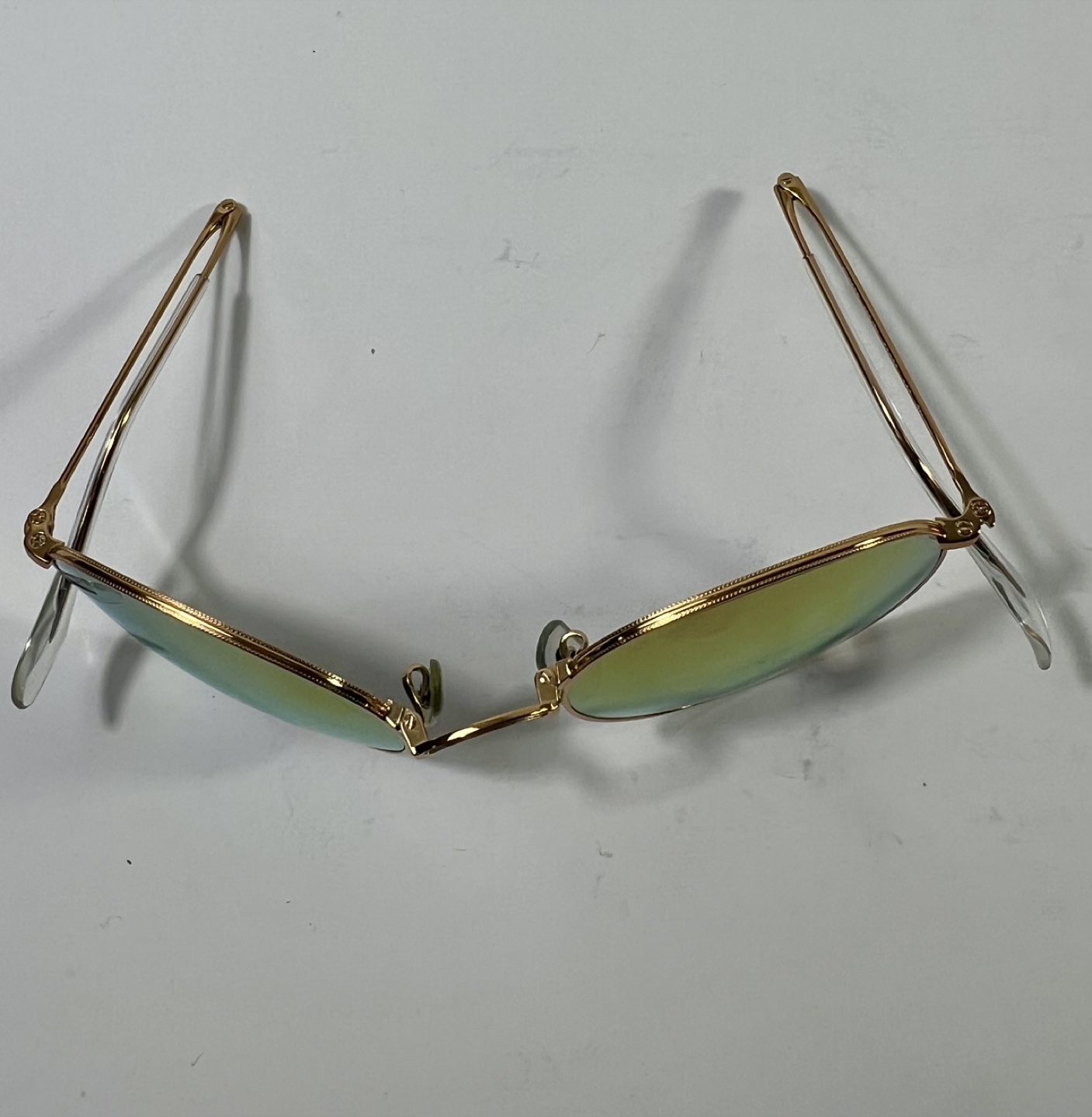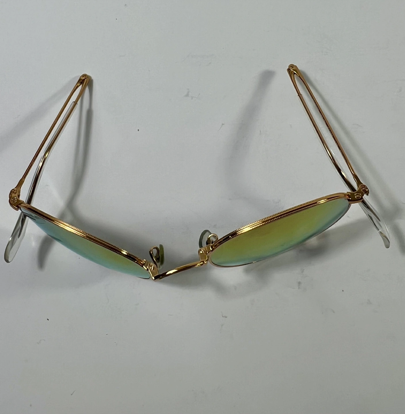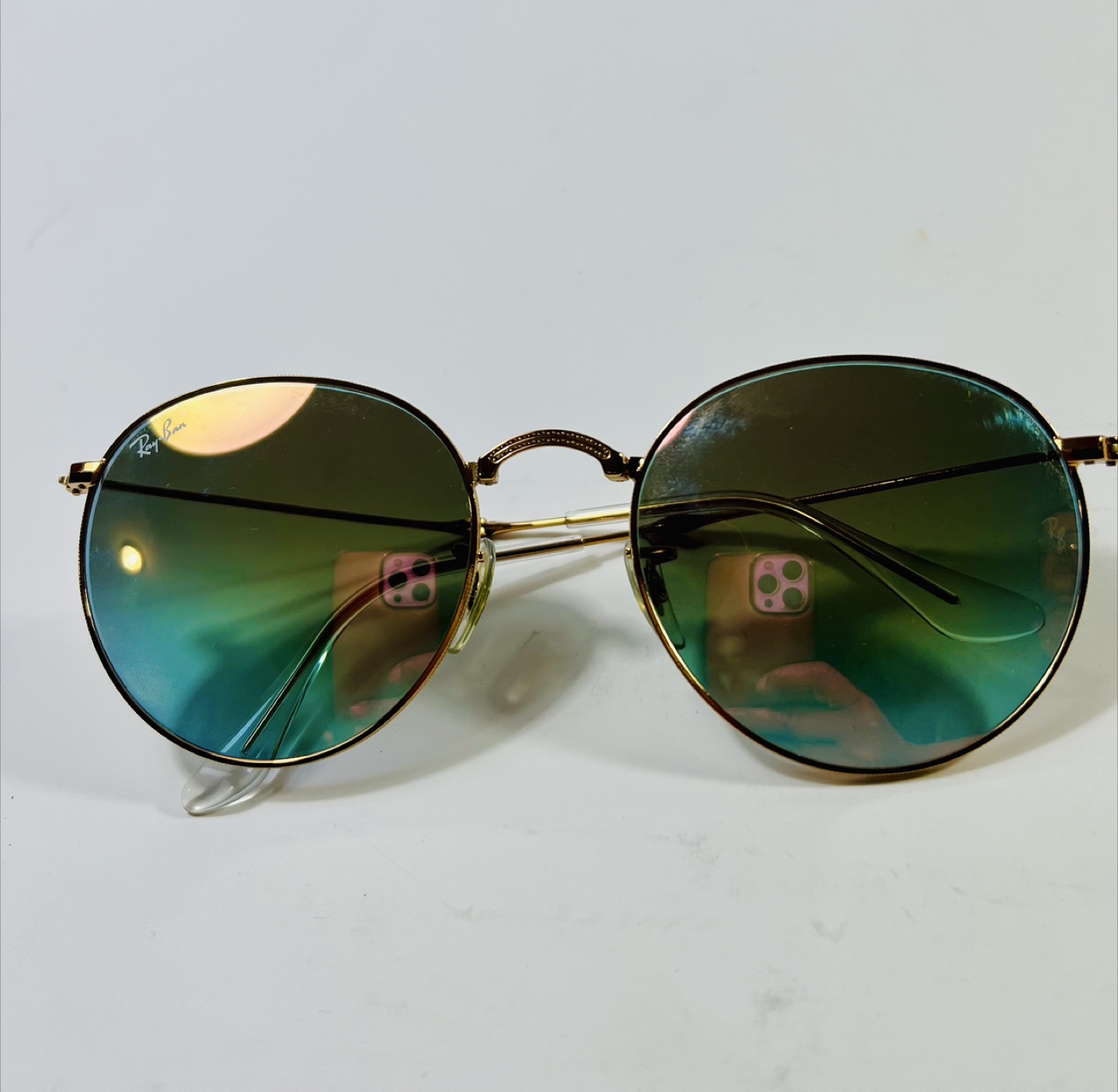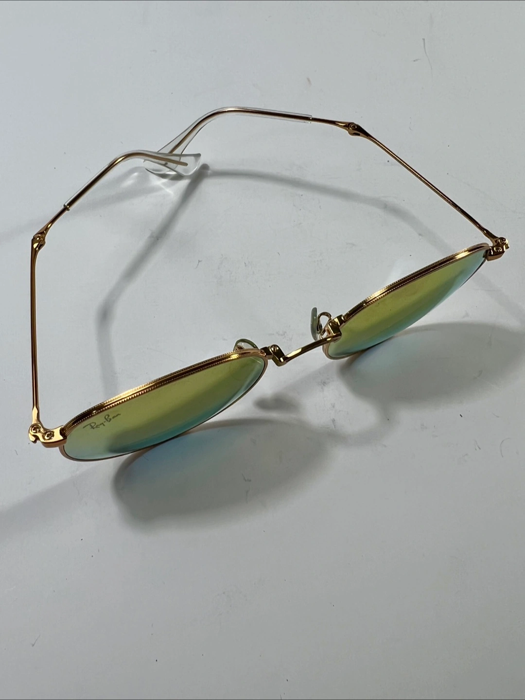 Selling a pair of Ray-Ban Round Metal sunglasses. They have a gold frame and unique lenses that shift between yellow and blue depending on the light. A stylish accessory to complete your look!