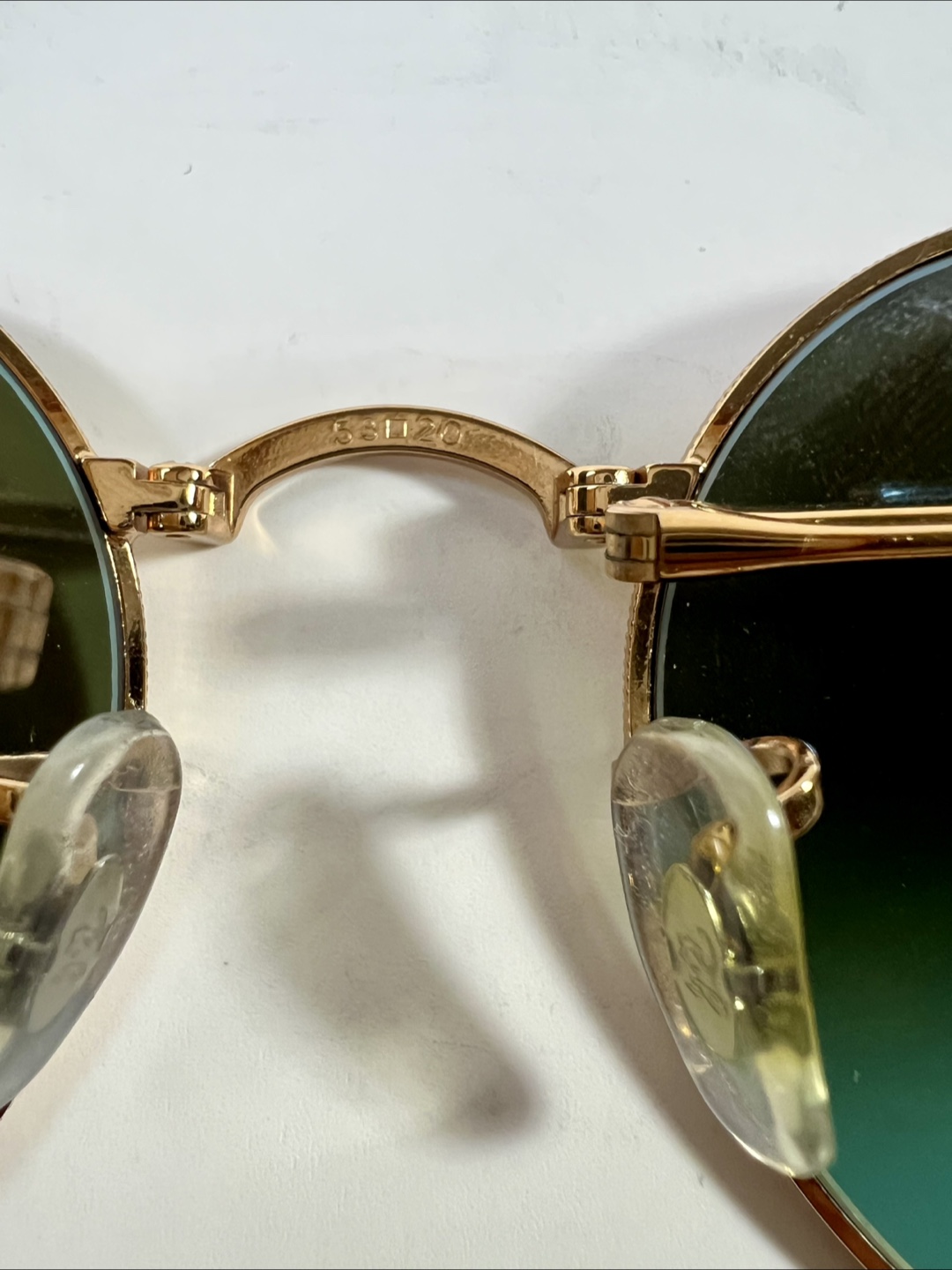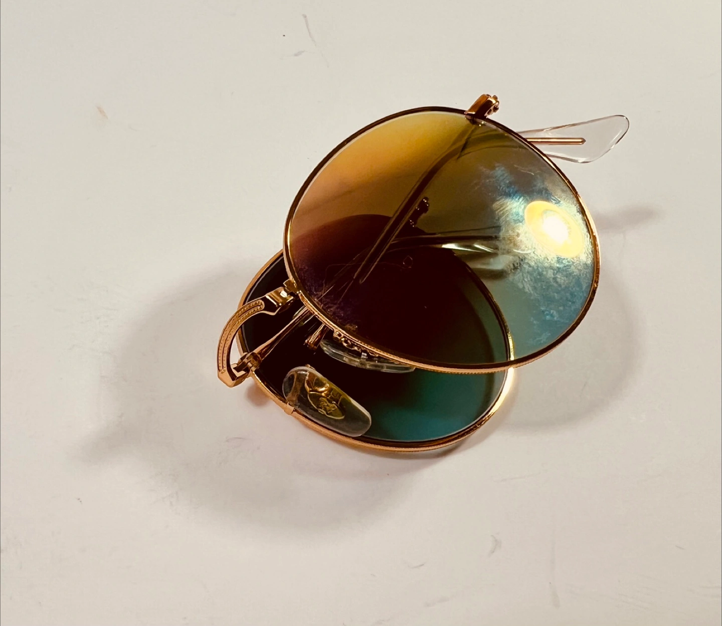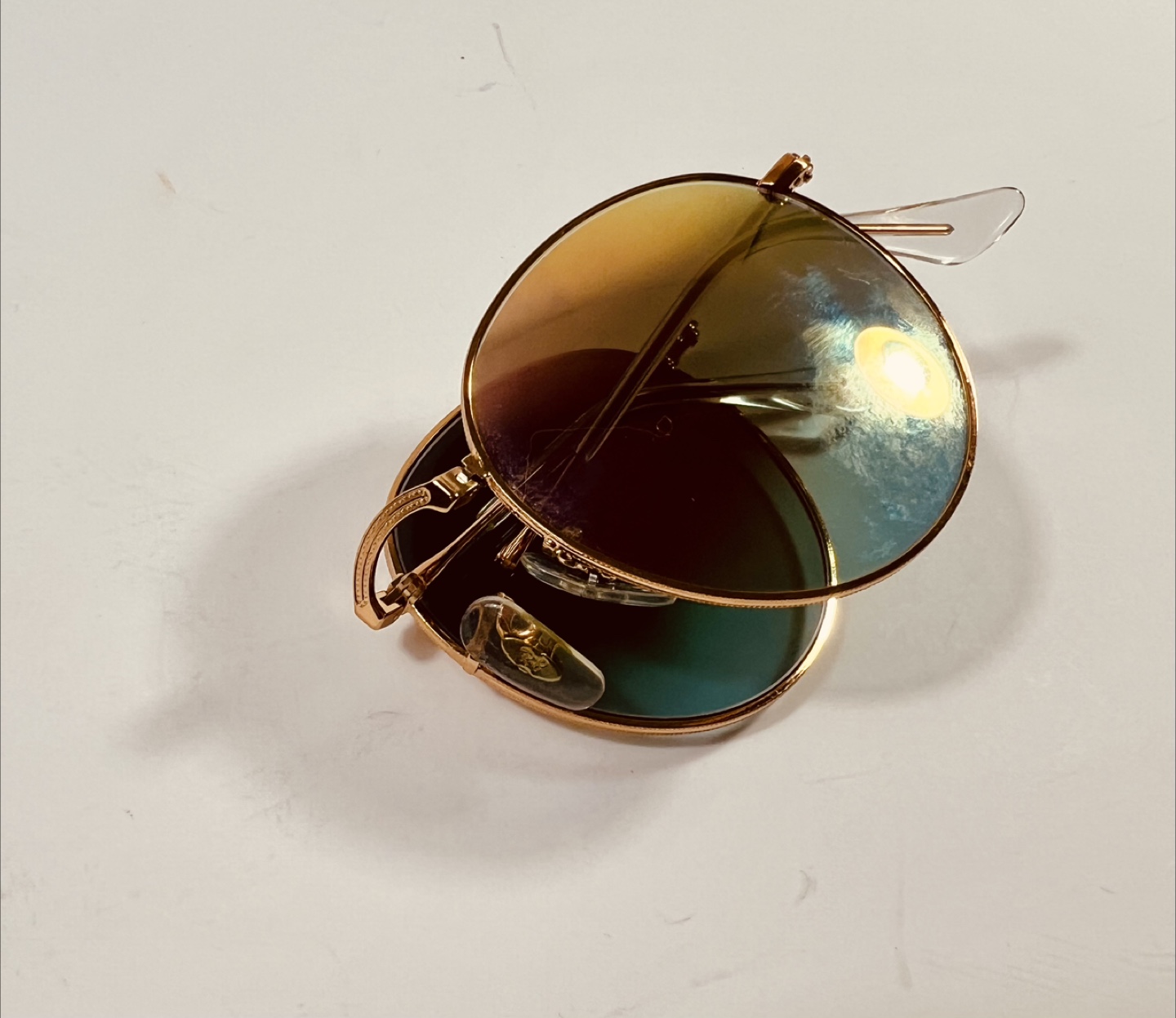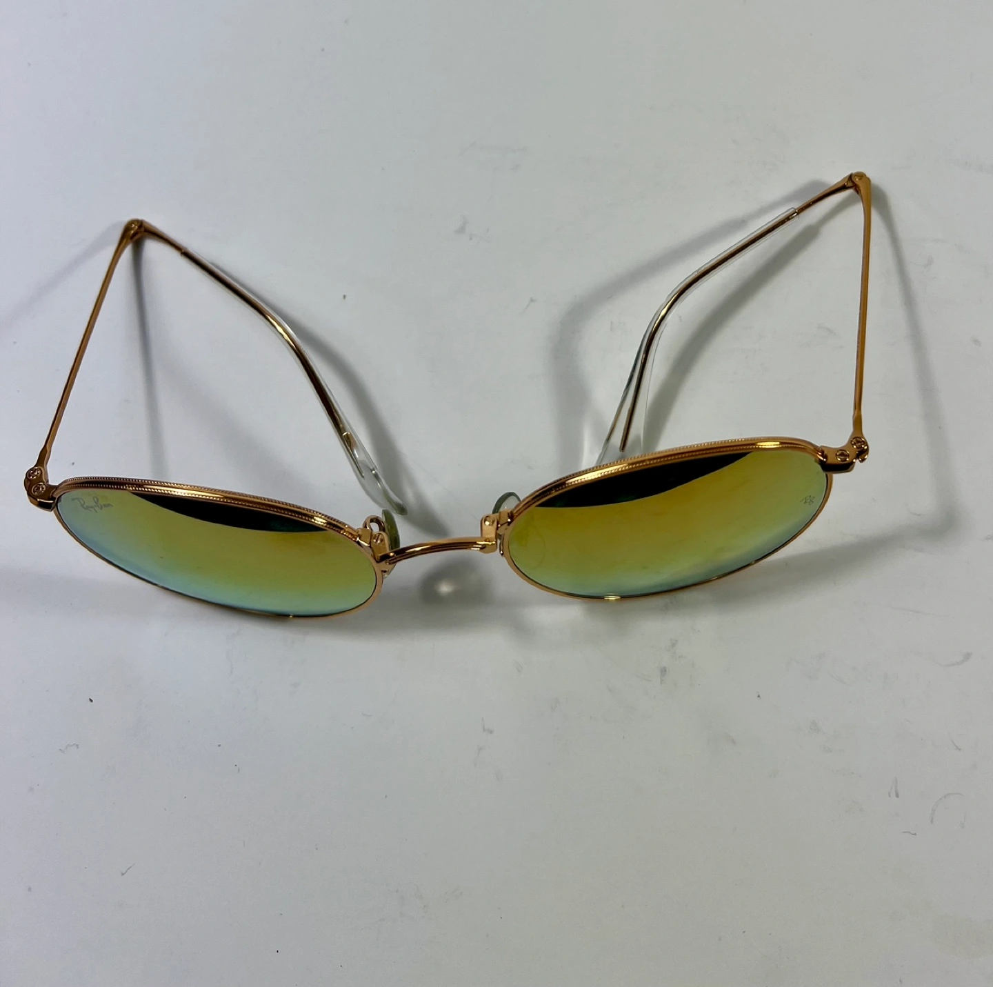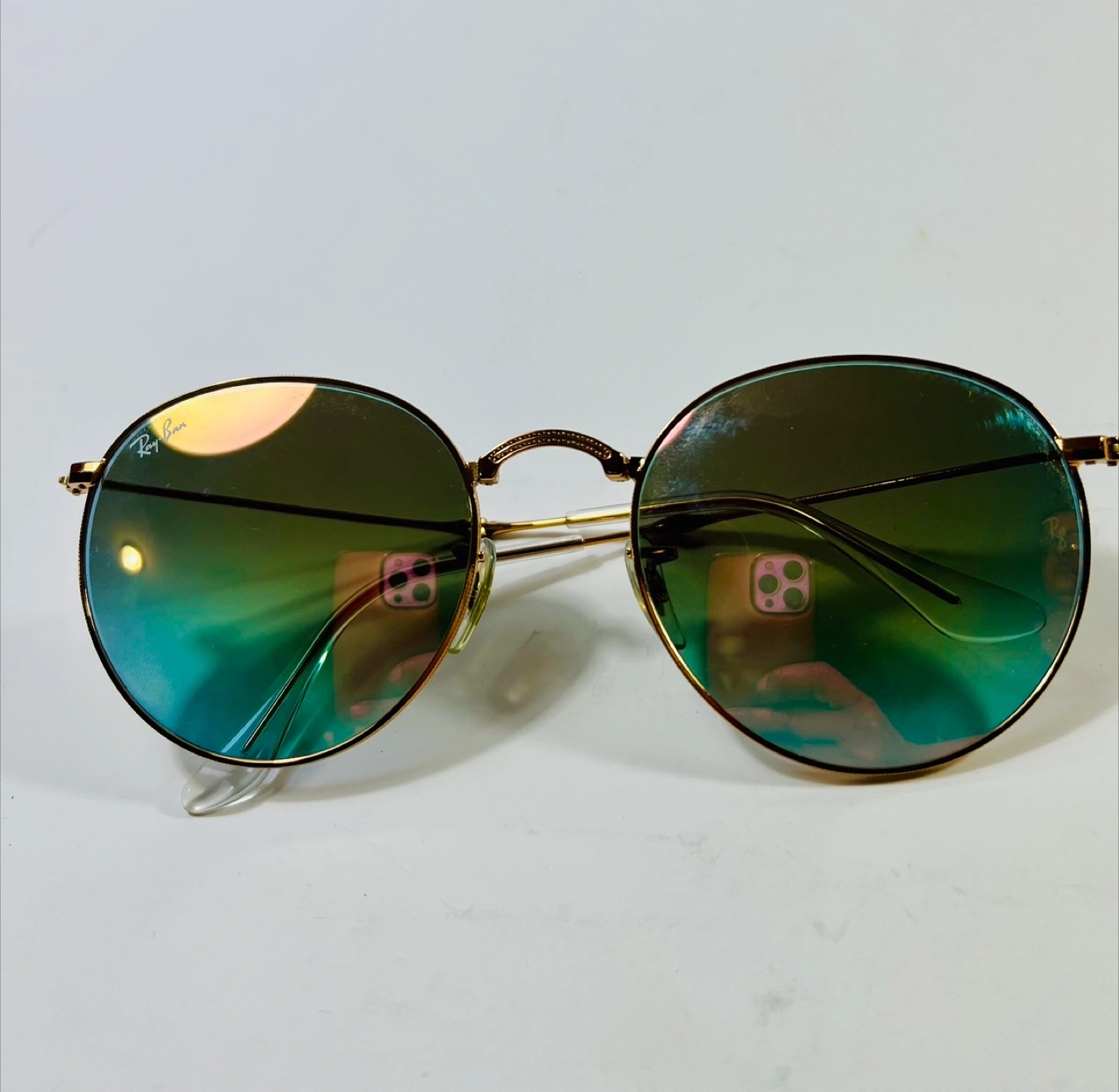 Selling a pair of Ray-Ban Round Metal sunglasses. They have a gold frame and unique lenses that shift between yellow and blue depending on the light. A stylish accessory to complete your look!