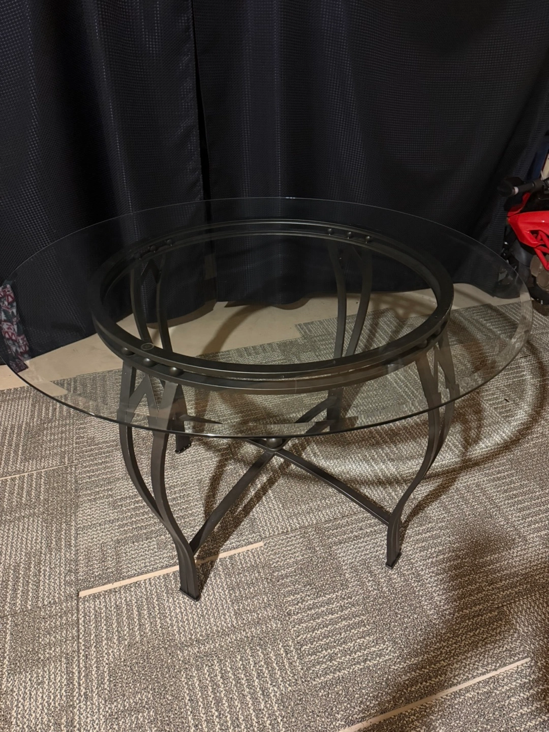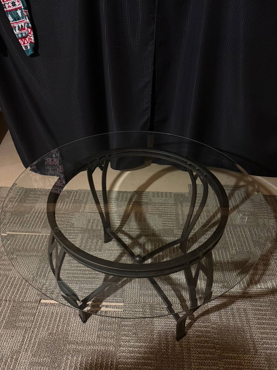Selling a glass top coffee table with a black metal frame. It's in great shape and would look lovely in any living room! The round design is both stylish and practical. It's a solid piece of furniture.
