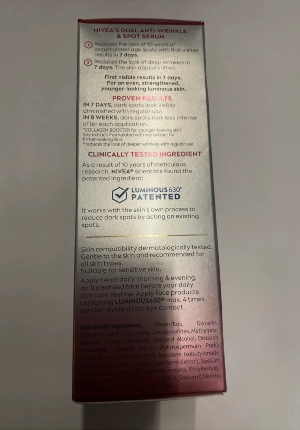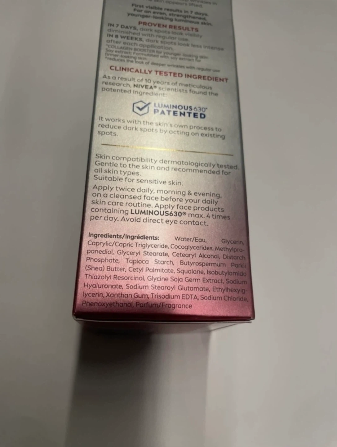 Brand new, unopened Nivea Luminous 630 Dark Spot Solution Serum! It's an anti-wrinkle and spot serum designed to visibly reduce 10 years of accumulated age spots in 7 days. It also contains a collagen booster. - Clinically tested ingredient - Suitable for sensitive skin - 30 mL You can get: 1 for $15 - OR - 3 for $40