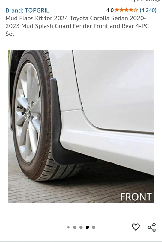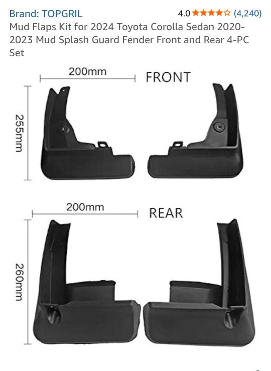 Selling a TOPGRIL Mud Flaps Kit designed for the 2024 Toyota Corolla Sedan. This 4-piece set includes both front and rear mud splash guards. They measure 255mm x 200mm (front) and 260mm x 200mm (rear). new in box
