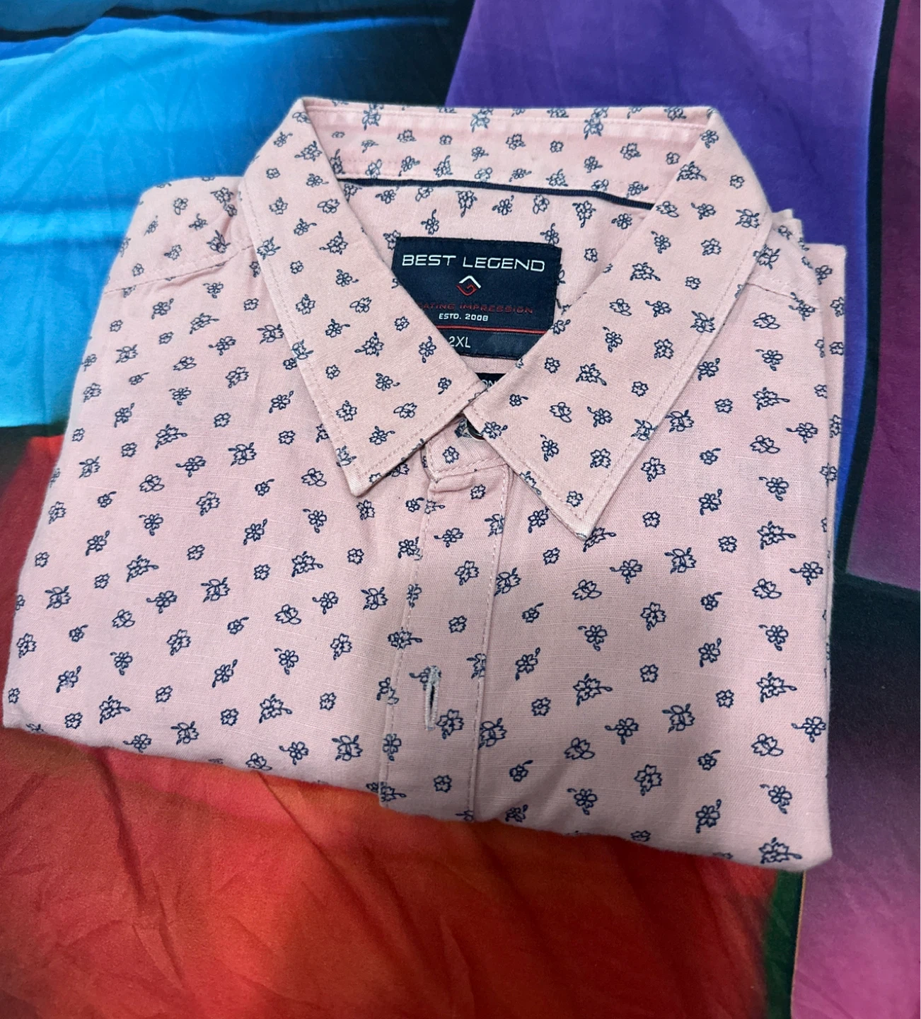 Here's a Best Legend shirt in size 2XL. It features a light pink colour with a navy floral print. Perfect for a casual or smart-casual look!