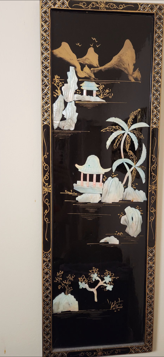 This is a lovely wall art panel with an Asian-inspired design. It features a black background with inlaid mother-of-pearl details depicting a landscape with mountains, trees, and pagodas. The frame has a decorative geometric pattern in gold. It would add a touch of elegance to any room!
