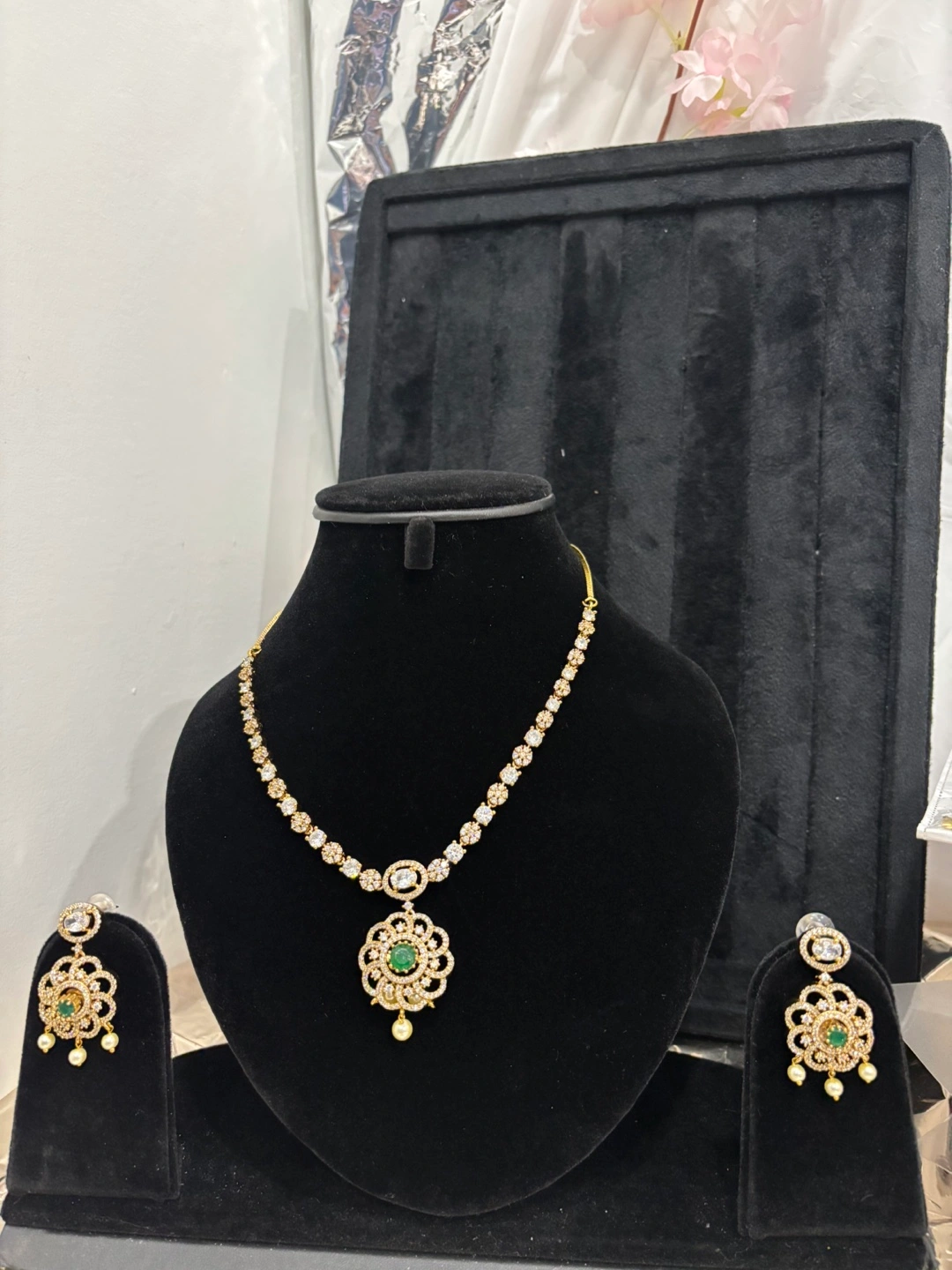 Grab in all colors Selling a beautiful necklace and earring set. The set features a gold-toned necklace with white stones and a green stone pendant, along with matching earrings. It's in great condition!