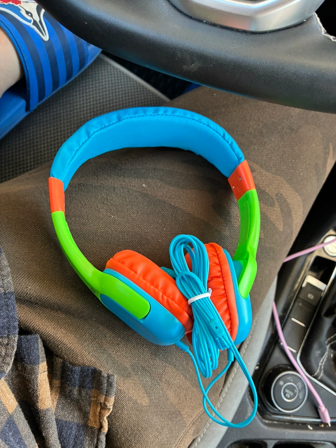 Selling a pair of kids headphones in bright blue, green, and orange! They look like they're in great shape and ready for a new home. Perfect for keeping the little ones entertained on road trips or at home