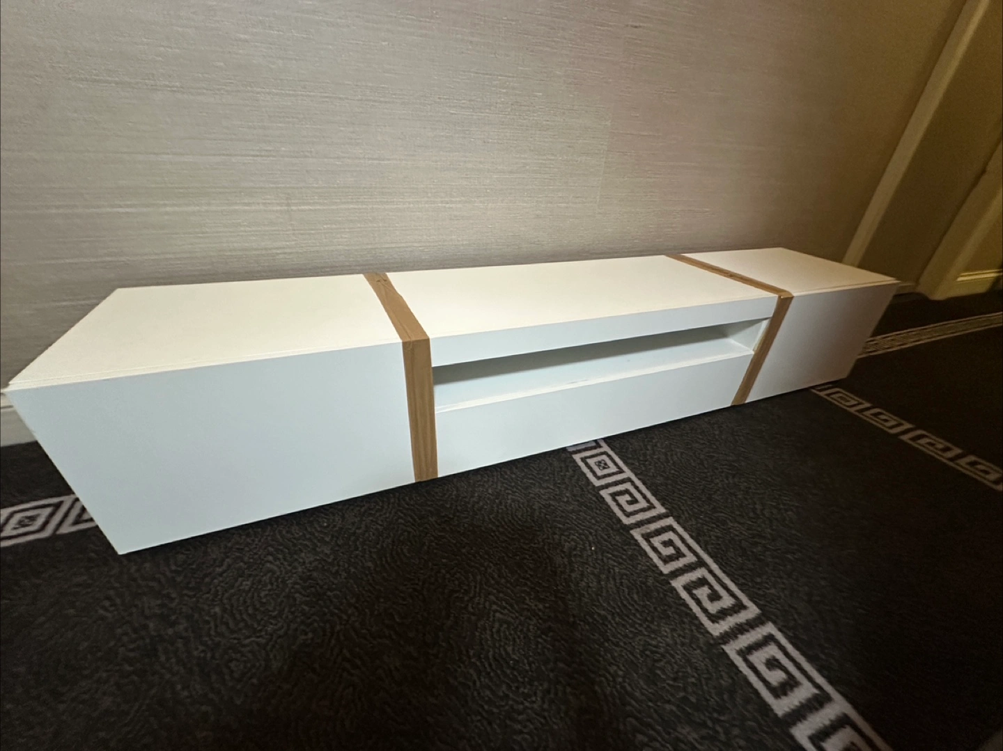 Selling a white TV stand in great condition! It's perfect for any living room and offers a sleek, modern look. It has a shelf and a drawer for storage, and the top is spacious enough for a large TV. It's in excellent shape and ready for a new home!